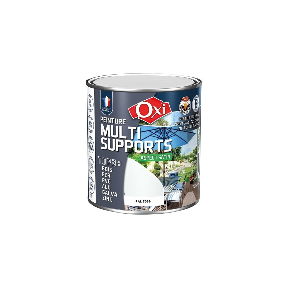 Existe en plusieurs coloris La peinture satin multi-support TOP3 de 500 mL en coloris gris clair RAL7035 de la marque Oxi est destinée à la décoration et la protection de nombreux matériaux bois, fer, PVC, métaux non ferreux, intérieurs et extérieurs. TOP3+ est une formule solvantée composée de résines de qualité supérieure et renforcée grâce à la « RUSTOL Technology ». Sur BOIS, TOP3+ est microporeux et protège de l'humidité, il s'oppose, sans cloquer, au vieillissement et à la dégradation des
