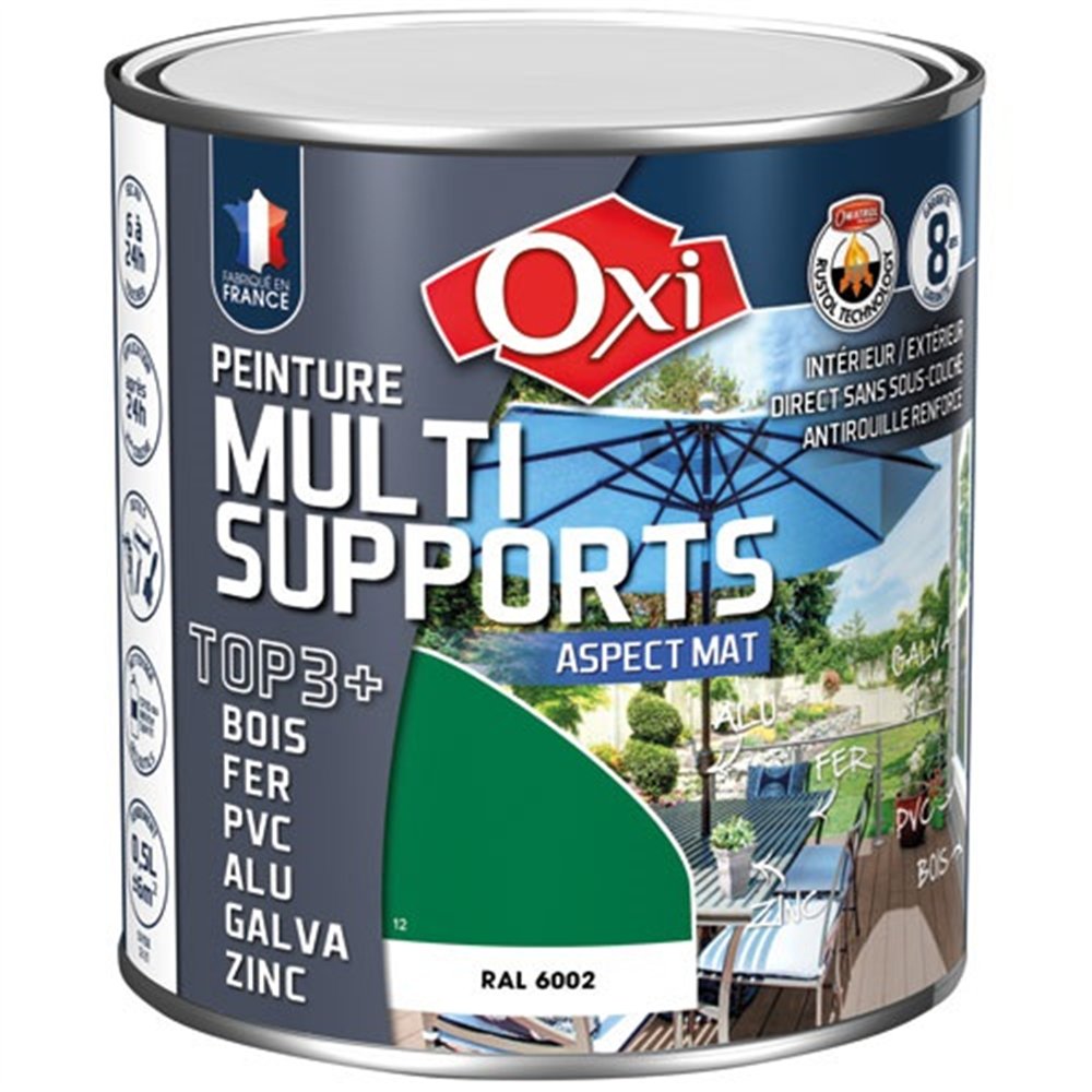 Grâce à sa formule solvantée enrichie en résines performantes, la TOP3 OXI adhère efficacement sur bois, fer, PVC et métaux non ferreux, sans nécessiter de primaire dans la majorité des cas. Elle résiste aux UV, à la pluie, à l'humidité et aux variations climatiques, garantissant une tenue optimale de la teinte vert jardin même sur les surfaces directement exposées aux éléments extérieurs. La finition mate absorbe la lumière pour un rendu naturel et sans reflet.