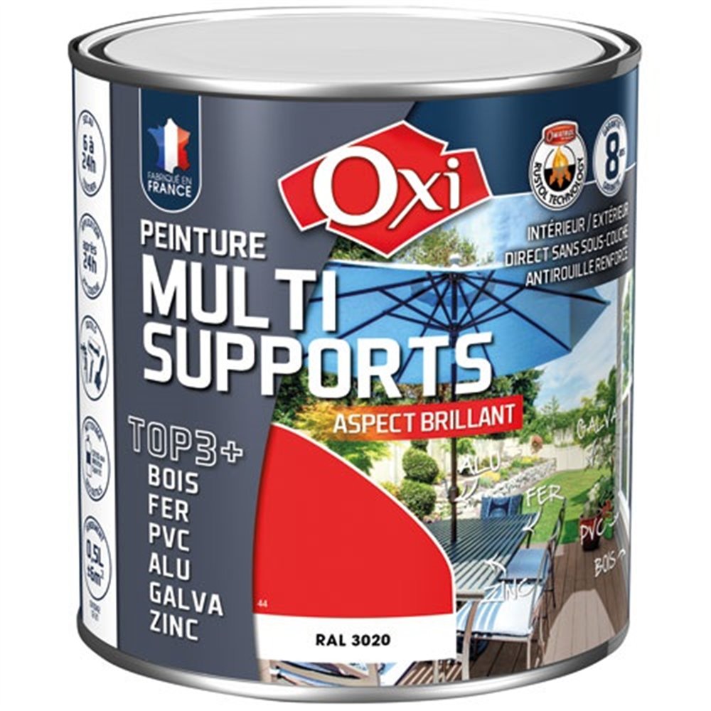 Avant de peindre, pensez à bien préparer vos surfaces : dépoussiérage, dégraissage et léger ponçage garantissent une adhérence optimale. Appliquez en une ou deux couches selon la couleur de départ, en respectant le temps de séchage entre chaque passe. Le rouge vif RAL3020 en 500 ml est disponible parmi de nombreuses teintes de la gamme TOP3 OXI.