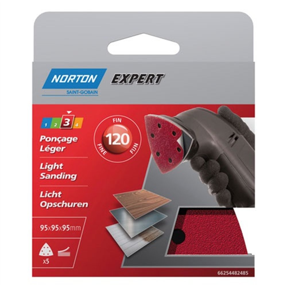 Pour un ponçage intermédiaire efficace, les triangles abrasifs Norton Expert grain 120 représentent la solution idéale entre dégrossissage et finition. Ce lot de 5 feuilles au format 95 mm s'adapte à toutes les ponceuses delta standard pour un résultat régulier sur une grande variété de matériaux.