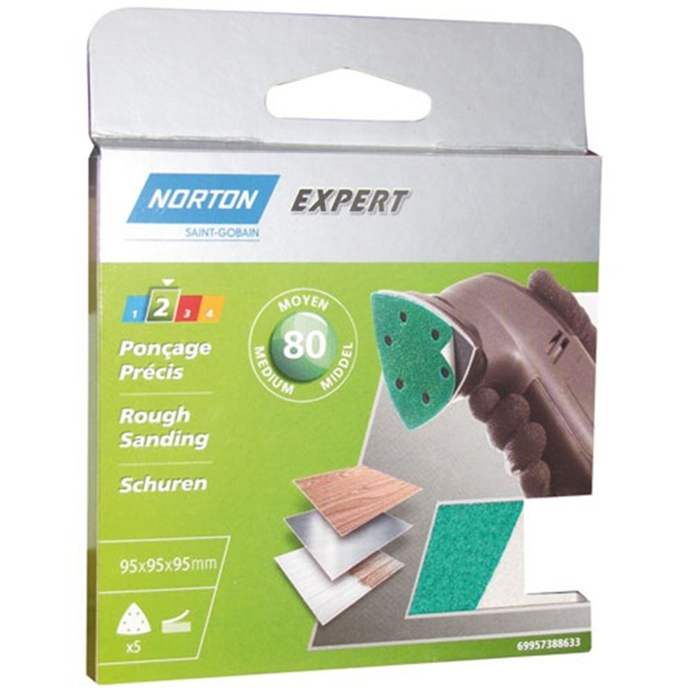 Le triangle abrasif perforé Norton Expert est une solution de ponçage haute performance conçue pour les ponceuses delta à plateau triangulaire. Avec un grain 80, cette garniture est idéale pour un ponçage puissant sur bois brut, surfaces peintes ou matériaux à dégrossir. Ce lot de 5 triangles de 95 mm vous assure une réserve de travail suffisante pour mener vos chantiers à bien.