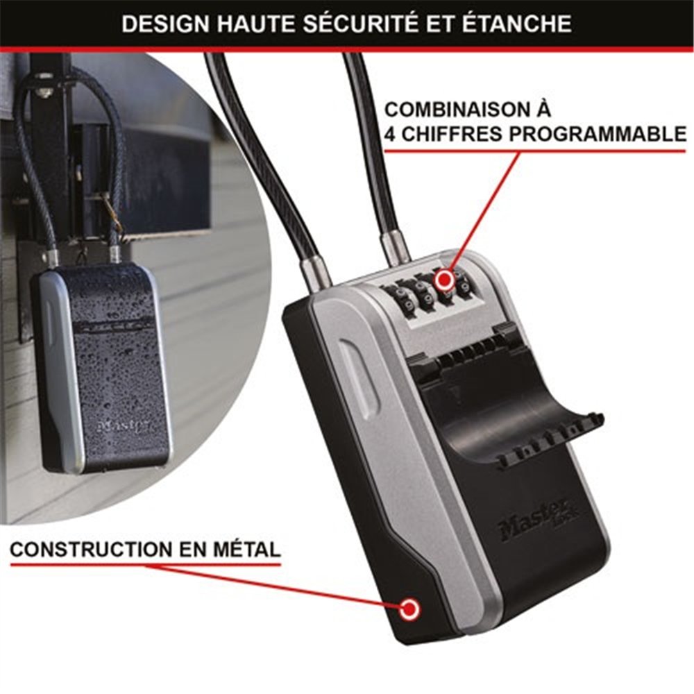 Alliant format généreux et praticité maximale, la boîte à clé amovible Master Lock à câble flexible 4 chiffres repense la gestion sécurisée des accès. Grâce à son câble amovible souple, elle peut s'adapter à une multitude de supports : poignées arrondies, barreaux, rampes d'escalier ou tout autre point d'ancrage inaccessible à une anse rigide.
