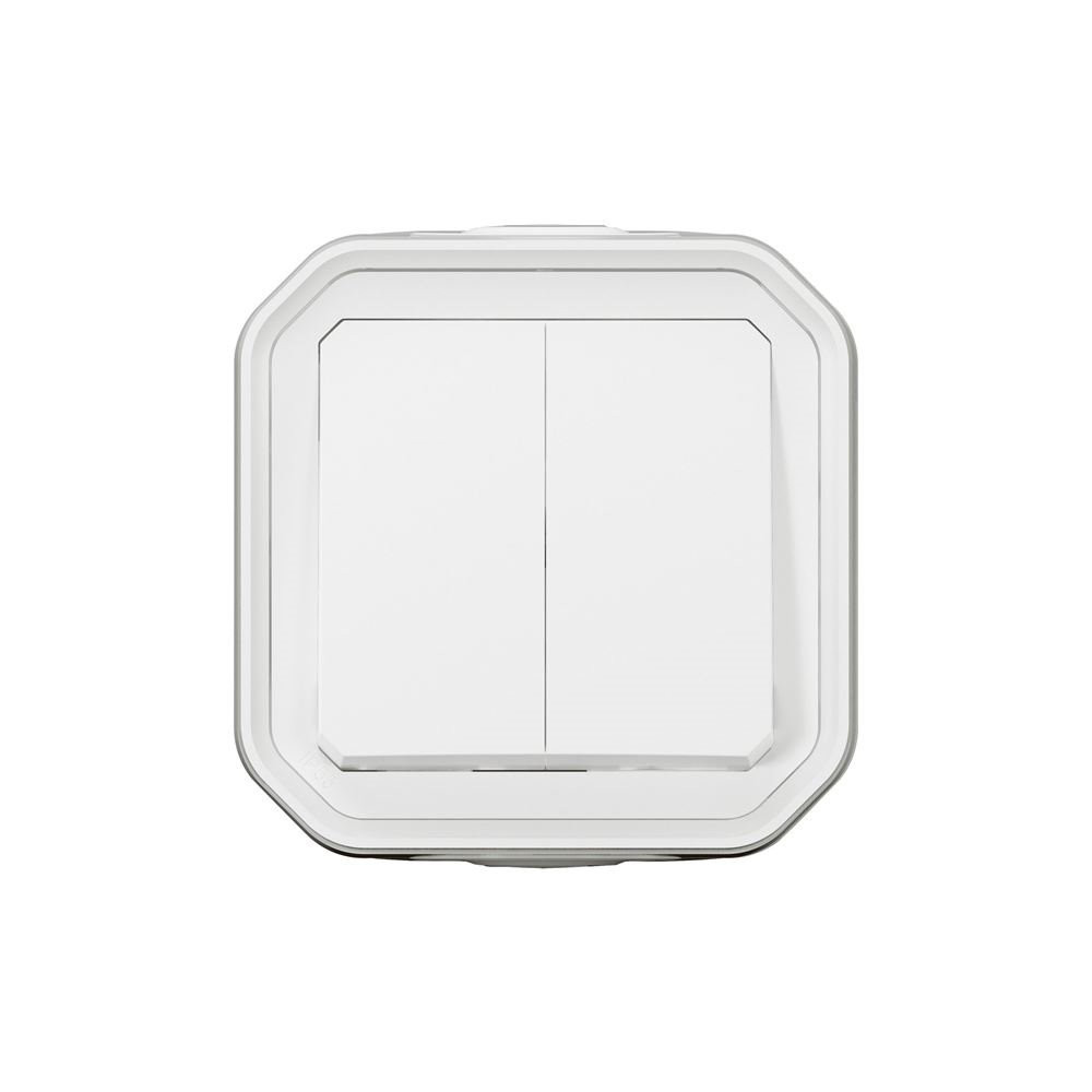 Commande double pour réaliser avec 1 référence plusieurs fonctions étanches IP55 : double interrupteur ou va et vient 10A ou double poussoir 10A. Plexo livré complet, prêt à installer en apparent au mur. finition blanc.