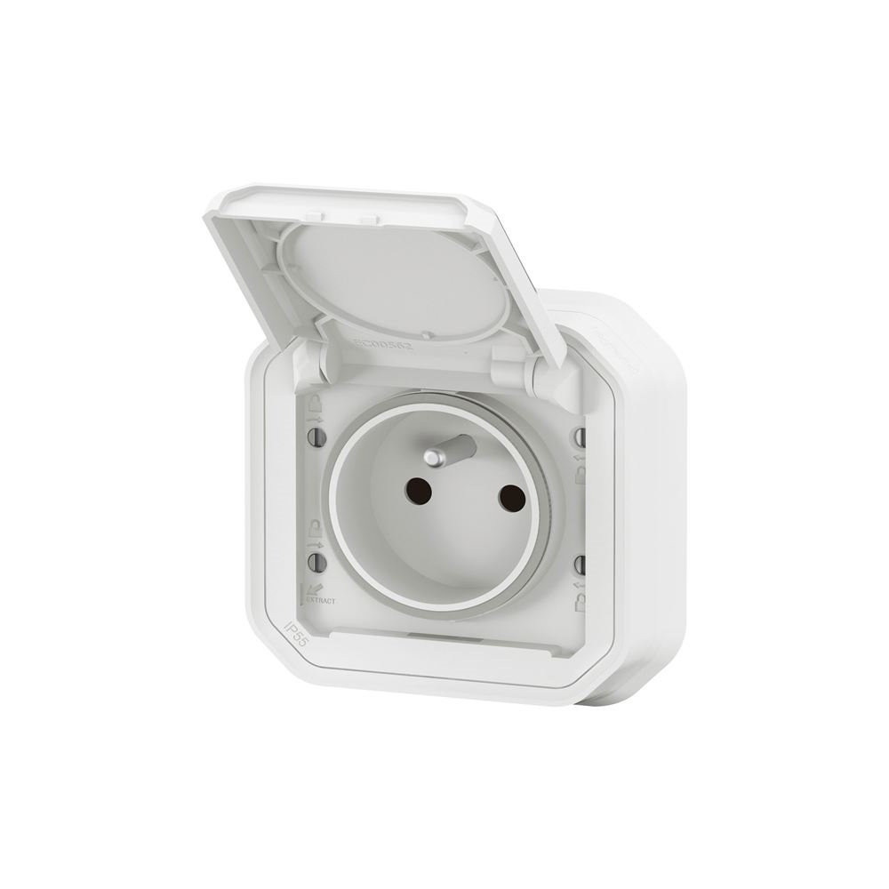 La prise de courant 2P+T Plexo complet encastré blanc de chez Legrand a un mécanisme équipé de bornes automatiques. IP 55 (indice de protection renforcée). Livrés complets avec support plaque et griffes de fixation (amovibles). Plexo, prise de courant étanche complète, prête à installer en encastré dans le mur, livrée avec support plaque et griffes. Prise de courant 2P+T à volet 16A 250V avec connexion rapide sans outil et repérage couleur. IP55 : protégé contre les poussières et les projections