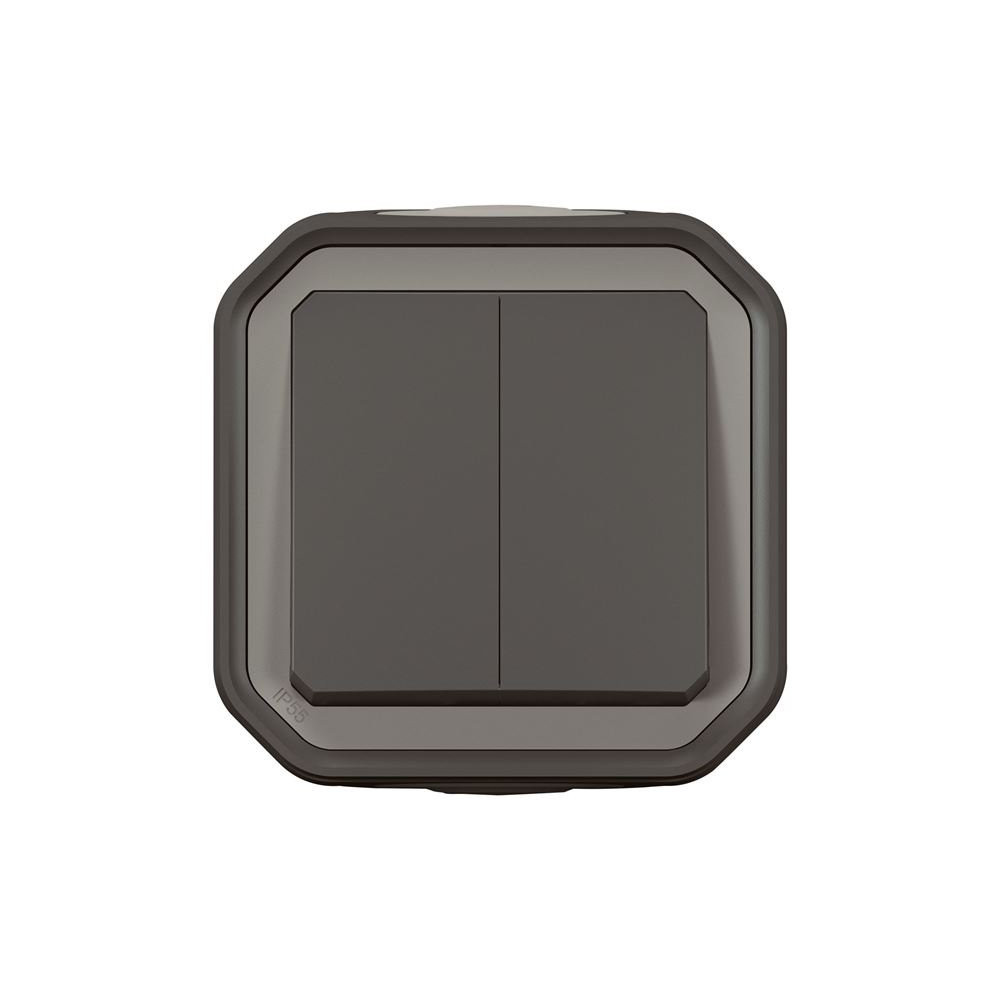 Commande double pour réaliser avec 1 référence plusieurs fonctions étanches IP55 : double interrupteur ou va et vient 10A ou double poussoir 10A. Plexo livré complet, prêt à installer en apparent au mur. finition anthracite.