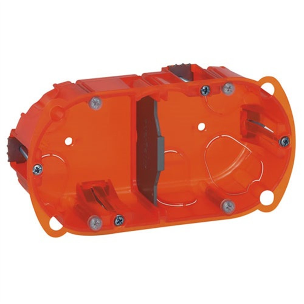 La boite à encastrer multi-matériaux Batibox 2 postes profondeur 40 mm orange de chez Legrand est une boîte à rigidité renforcée pour installation dans plaque de plâtre, contreplaqué, tôle, brique, carreau de plâtre, parpaing, brique. Boîte à installer dans le mur et qui vous permet de fixer votre appareillage. Possibilité de sceller les boîtes multimatériaux en maçonnerie et d’injecter des matériaux de scellement (scellement chimique, mousse de polyuréthane, néoprène... Equipée d'étriers métall