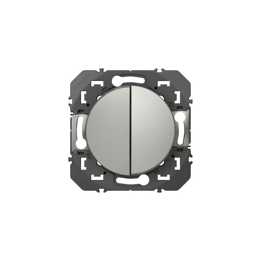 Cet interrupteur double embarque deux mécanismes va-et-vient 10A sous un même habillage, réduisant ainsi le nombre de points d'installation nécessaires. Il fait partie de la gamme Dooxie de Legrand, synonyme de qualité, de facilité de pose et de design sobre, disponible dans une palette de coloris dont cet aluminium particulièrement recherché.