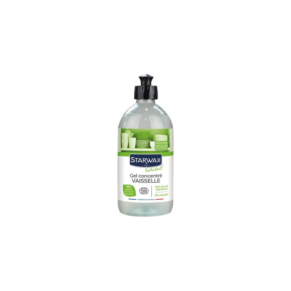 Fini la vaisselle incrustée et les résidus gras tenaces ! Le Gel Vaisselle Concentré STARWAX SOLUVERT en 500 ml allie un haut pouvoir dégraissant à une composition responsable certifiée Ecocert. Avec 99,9 % d'ingrédients d'origine naturelle, il s'adresse à tous ceux qui veulent une vaisselle impeccable sans compromis environnemental.