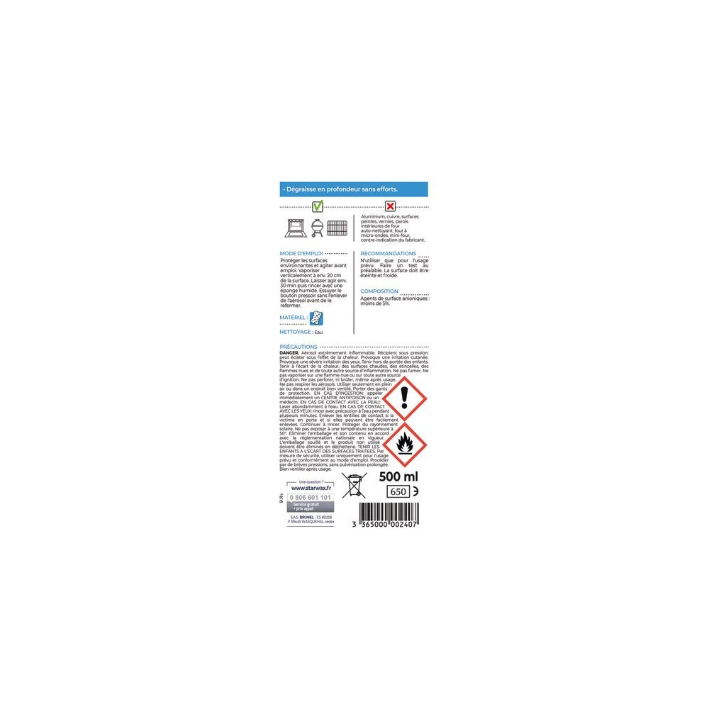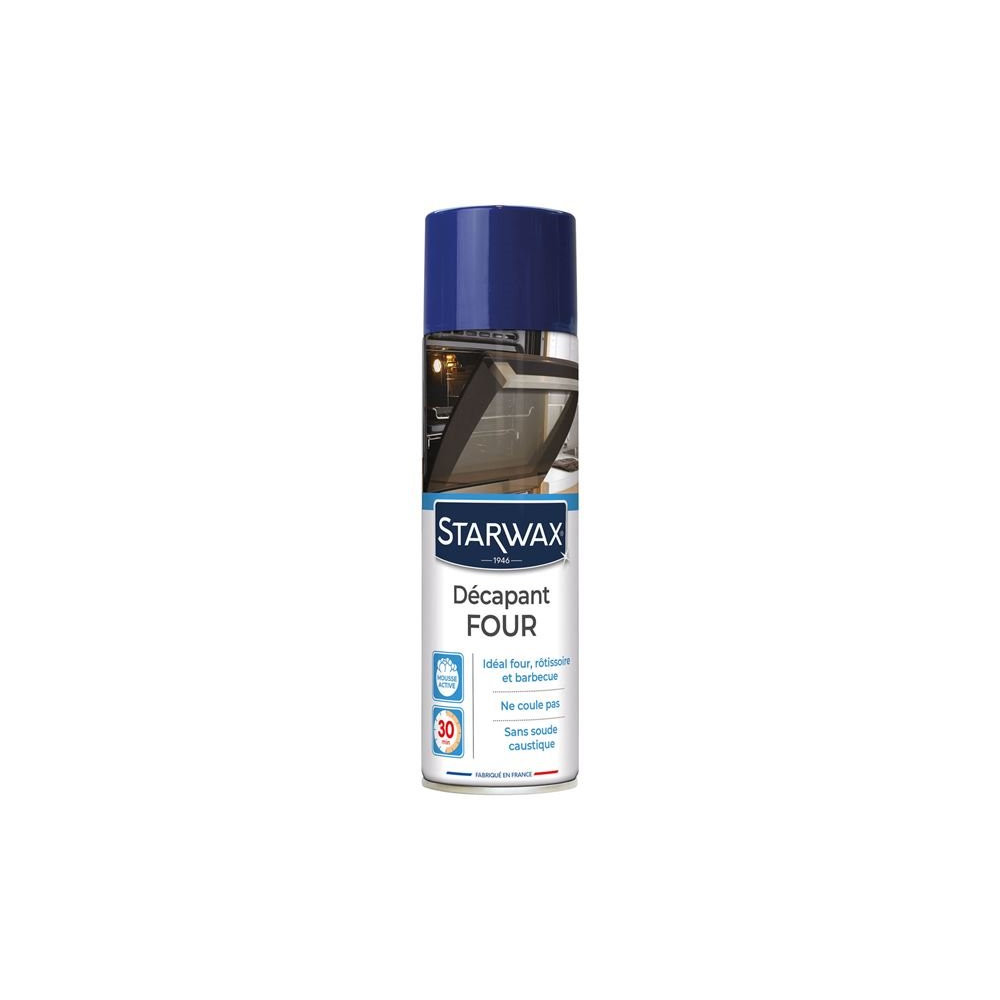 Le décapant four et accessoires en aérosol de 500 mL de la marque STARWAX dégraisse sans effort votre four, rôtissoire, barbecue et grill. Agit en 30 minutes pour nettoyer les graisses même recuites. S'utilise sur surfaces froides ou tièdes. Ne coule pas. Fabriqué en France.