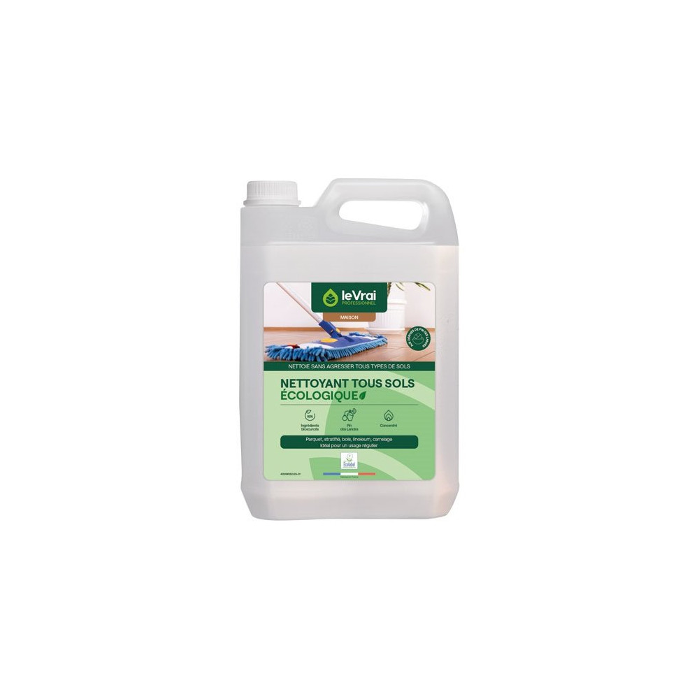 Le Nettoyant tous sols écologique 5L de LE VRAI PRO MAISON est une solution de nettoyage professionnelle formulée à partir d'une biotechnologie avancée pour répondre aux exigences du quotidien tout en respectant l'environnement. Son grand format 5 litres en fait un allié économique et pratique pour les foyers qui souhaitent allier efficacité et éco-responsabilité.