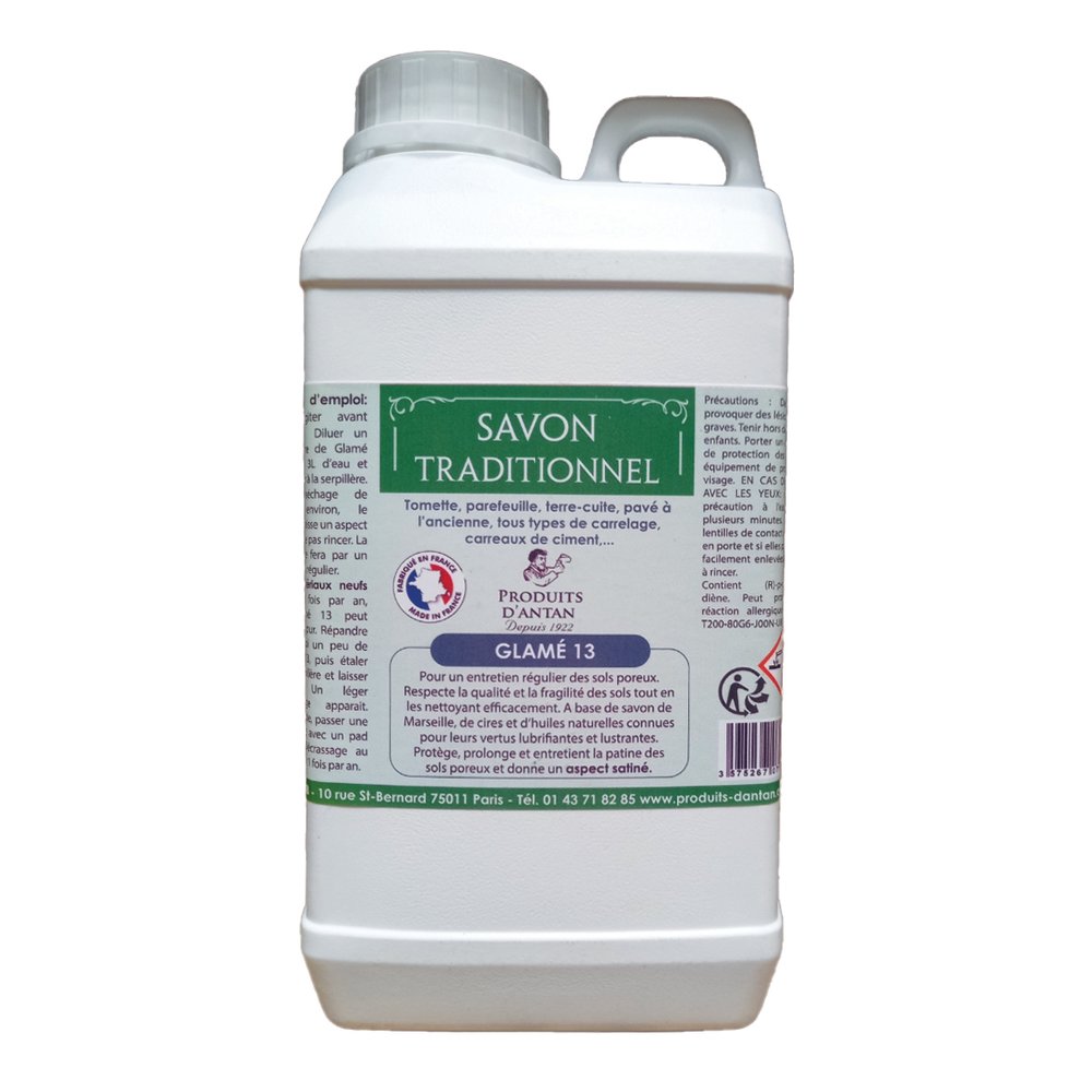 Conçu pour répondre aux exigences des sols anciens et contemporains les plus sensibles, le GLAMÉ 13 de Produits d'Antan est un savon naturel en format 1 litre dédié à l'entretien des tomettes, de la terre cuite et des carreaux de ciment. Sa formulation naturelle et douce en fait un allié incontournable pour les surfaces hydrofugées ou traitées qui nécessitent un soin adapté.