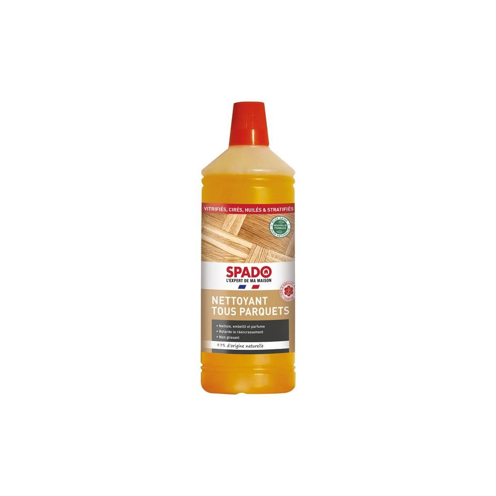 Prendre soin de son parquet n'a jamais été aussi simple grâce au nettoyant tous parquets SPADO en flacon de 1 litre. Spécialement formulé pour les sols en bois, ce produit du quotidien nettoie en profondeur, élimine les taches, embellit la surface et laisse un parfum agréable de fraîcheur. Qu'il s'agisse d'un parquet ancien aux planches patinées ou d'un revêtement moderne posé récemment, il s'adapte à tous les profils.