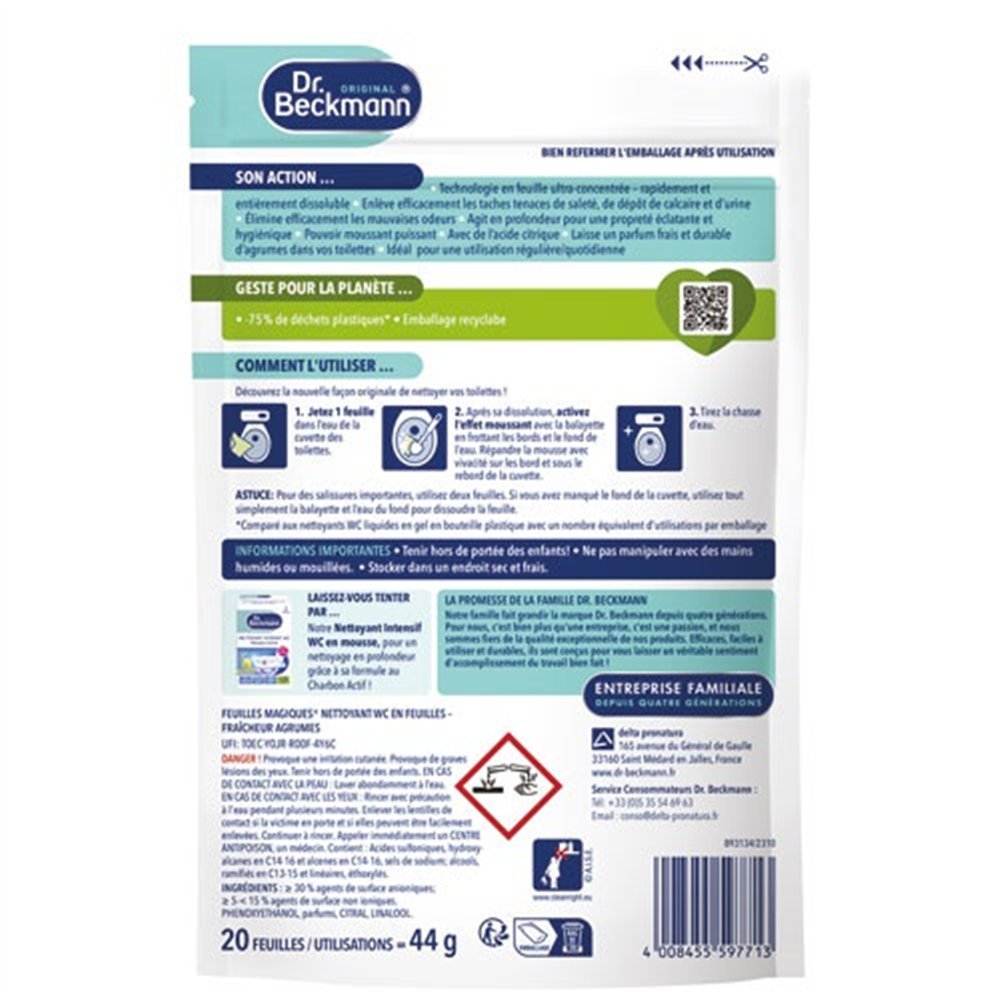 Les Feuilles Magiques nettoyant WC Dr Beckmann parfum agrumes, boîte de 20 feuilles, réinventent le geste du nettoyage des toilettes au quotidien. Ce format innovant et disruptif en feuilles solubles séduit par sa praticité absolue : plus de flacons encombrants, plus d'éclaboussures, une dose parfaitement mesurée à chaque utilisation.