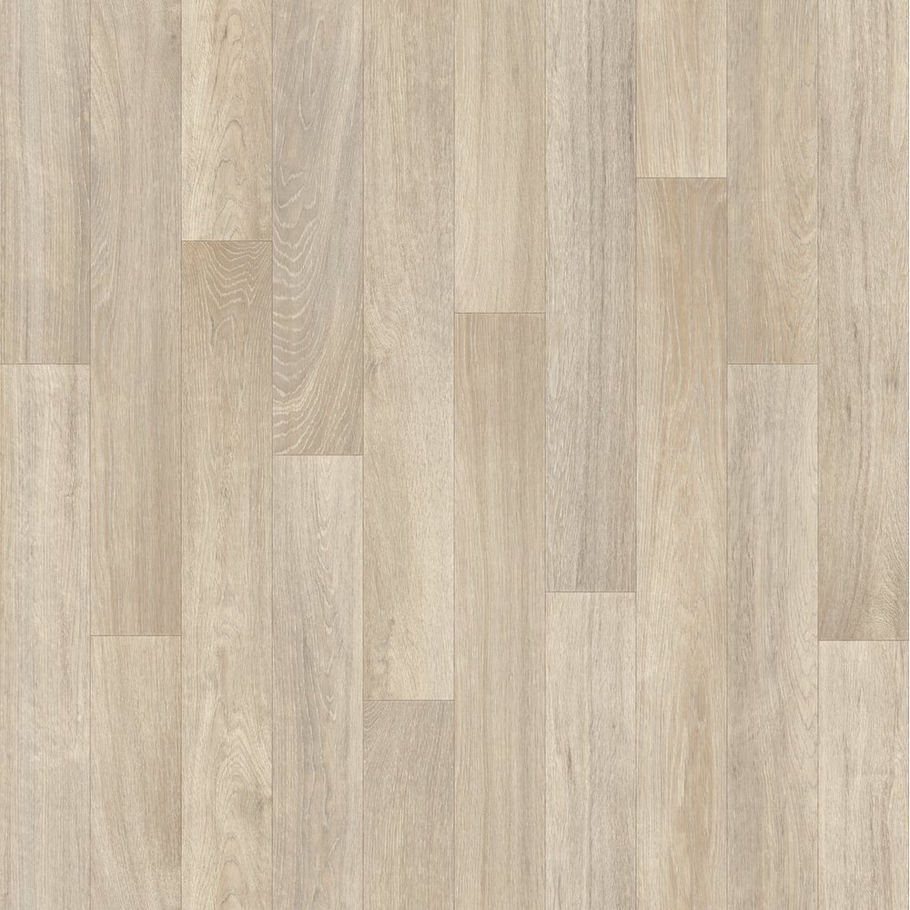 La teinte chêne blanchi de ce revêtement s'harmonise naturellement avec des meubles clairs, des murs blancs ou des tons pastel, mais se marie aussi très bien avec des éléments de décoration plus sombres pour créer des contrastes élégants. Sa grande laize de 4 m limite les raccords lors de la pose et simplifie la mise en œuvre, même pour les bricoleurs non professionnels.