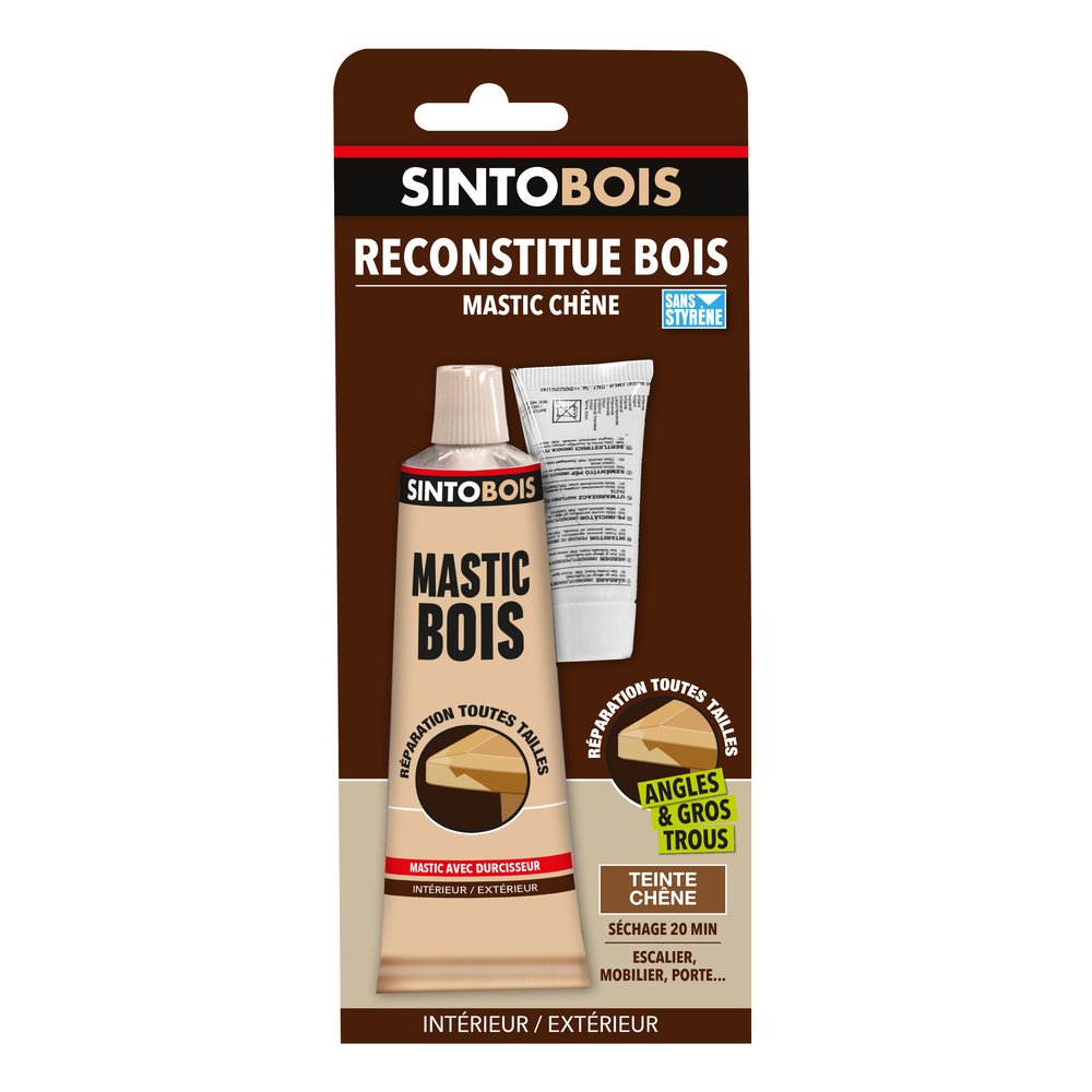 Le Sintobois est particulièrement adapté aux réparations d'angles abîmés, de gros trous, de fissures profondes ou de parties manquantes sur escaliers, meubles, encadrements de portes et parquets teintés chêne. Sa texture malléable facilite la mise en forme avant durcissement, permettant même de reconstituer des profils complexes.