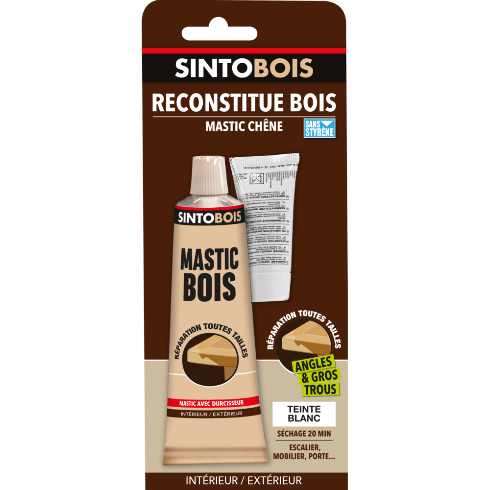 Le Sintobois Mastic Reconstitue Bois SINTO en coloris blanc est une solution professionnelle bi-composant conçue pour réparer, restaurer et reconstituer les parties de bois endommagées ou manquantes. Sa formulation sans styrène garantit une utilisation plus saine, aussi bien en intérieur qu'en extérieur, sur bois massifs et tous leurs dérivés (MDF, contreplaqué, aggloméré…).