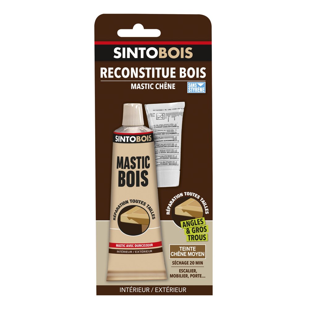 Ce produit convient parfaitement pour boucher, coller et reconstituer des parties manquantes ou dégradées : angles abîmés, éclats, trous profonds, fissures sur parquet, meubles, escaliers ou huisseries en chêne. La teinte chêne moyen assure un rendu naturel qui se fond dans la masse du bois sans nécessiter une mise en peinture systématique.