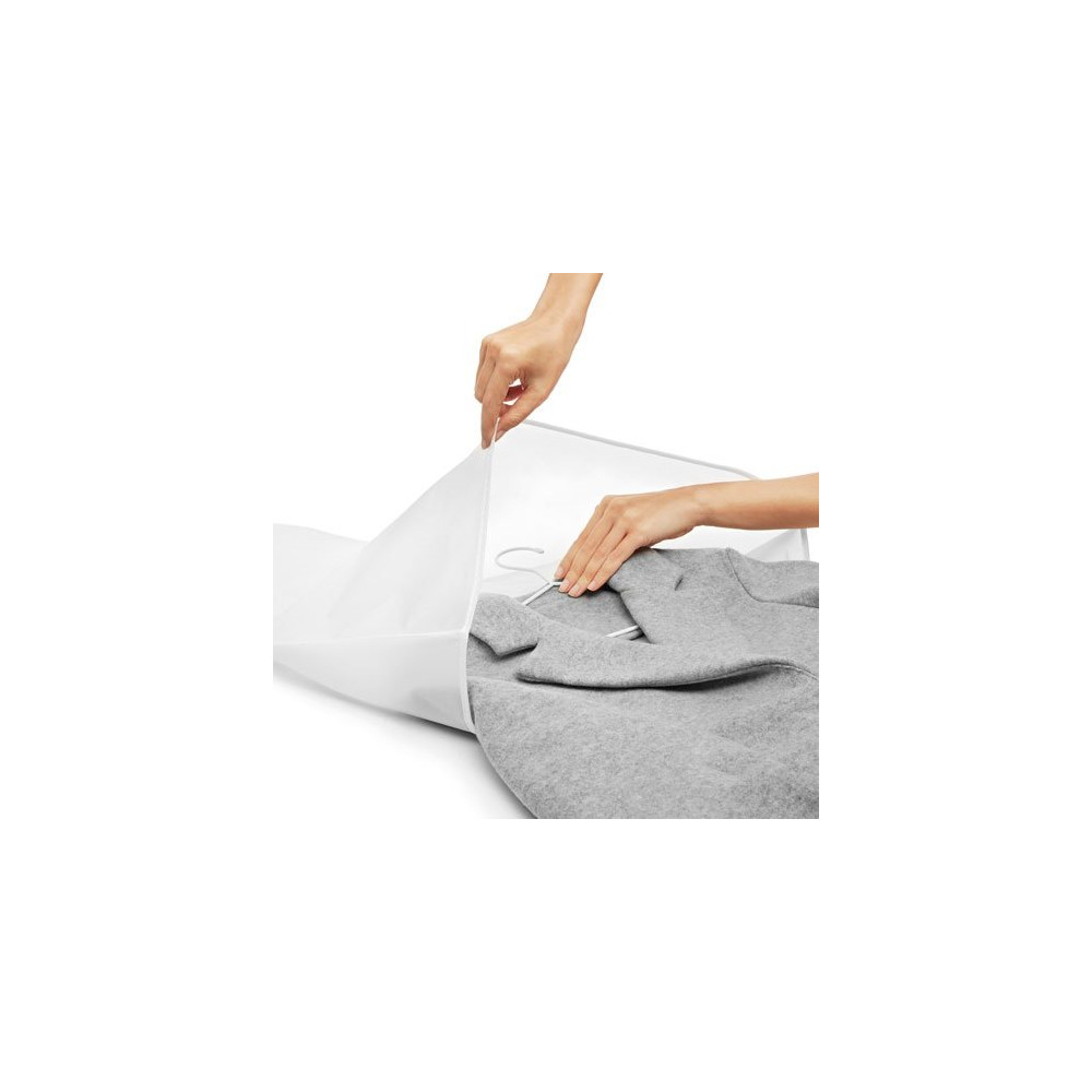 La grande nouveauté de ce modèle par rapport à ses homologues : une fenêtre transparente intégrée qui permet d'identifier en un coup d'œil le vêtement contenu dans la housse, sans avoir à l'ouvrir. Pratique au quotidien, surtout quand plusieurs housses cohabitent dans un même espace. Son coloris gris élégant apporte une touche sobre et uniforme à votre penderie.