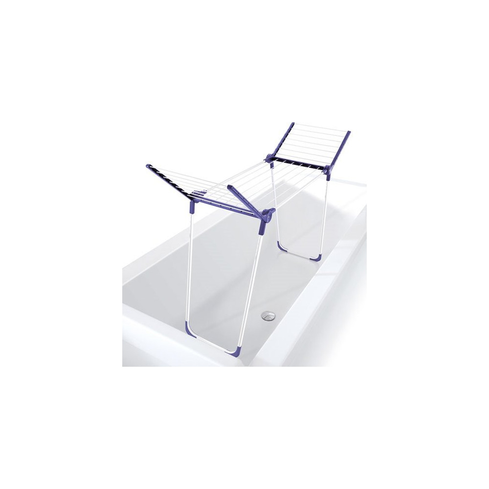 Sa capacité d'étendage de 12 mètres linéaires permet de prendre en charge l'équivalent d'une machine entière en une seule session. La hauteur des ailes portée à 93 cm est pensée pour accueillir sans les plier les pièces longues : draps, pantalons, robes ou chemises. Deux pieds robustes assurent une stabilité exemplaire, même en charge complète.