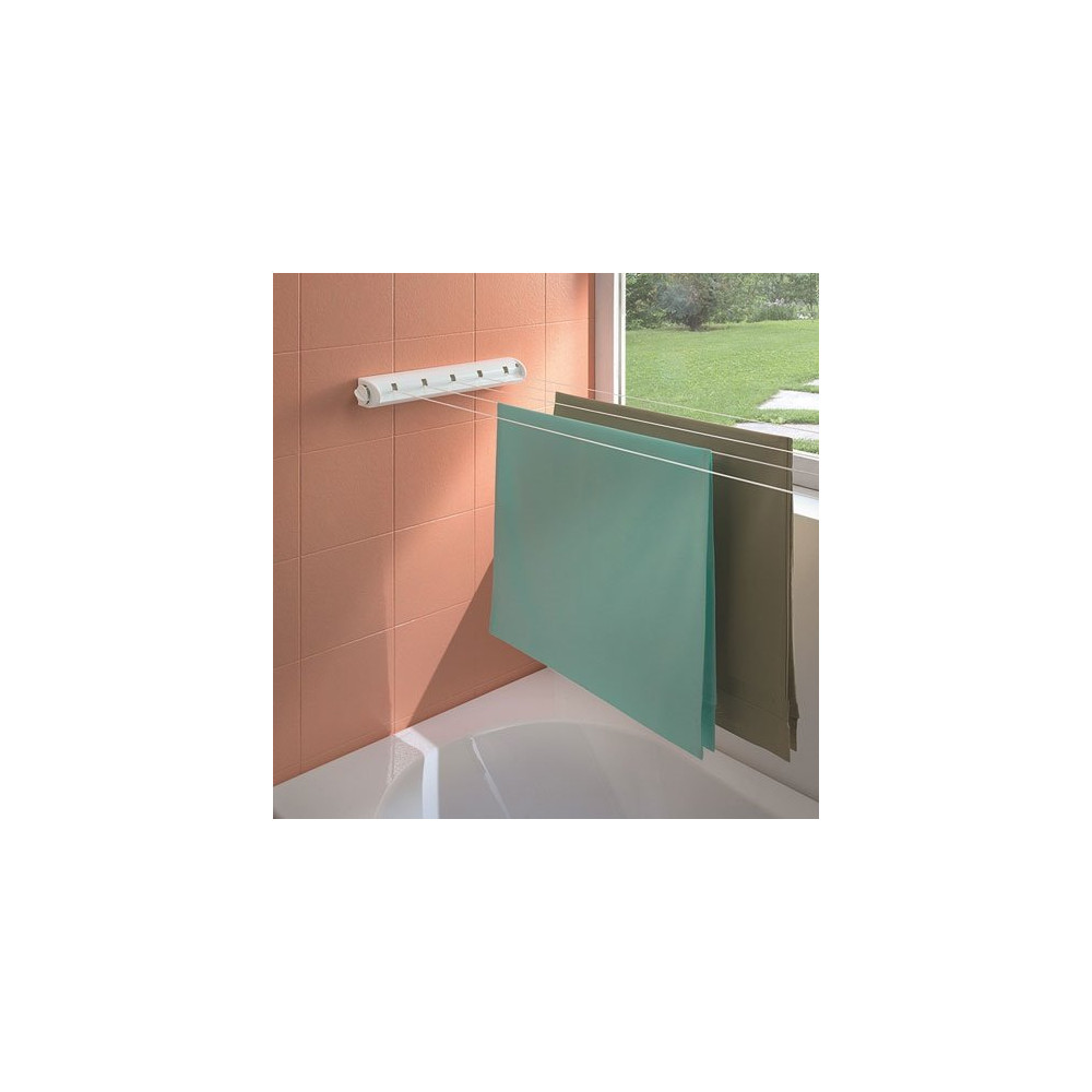 Enroulage automatique. Largeur 39 cm. Molette de réglage de la tension. Blocage possible à toutes les longueurs. 5 cordes nylon de 4.20m. En ABS.