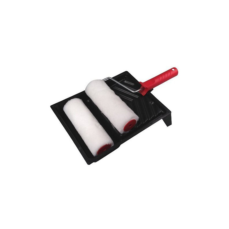 Le kit comprend 2 manchons peinture mate et satinée, une monture manche polypropylène de 175 mm de large et un bac à peindre avec grille intégrée. La grille intégrée au bac permet d'essorer facilement le manchon pour une répartition homogène de la peinture et un résultat sans surplus ni coulure. La monture large de 175 mm assure une couverture rapide des grandes surfaces.