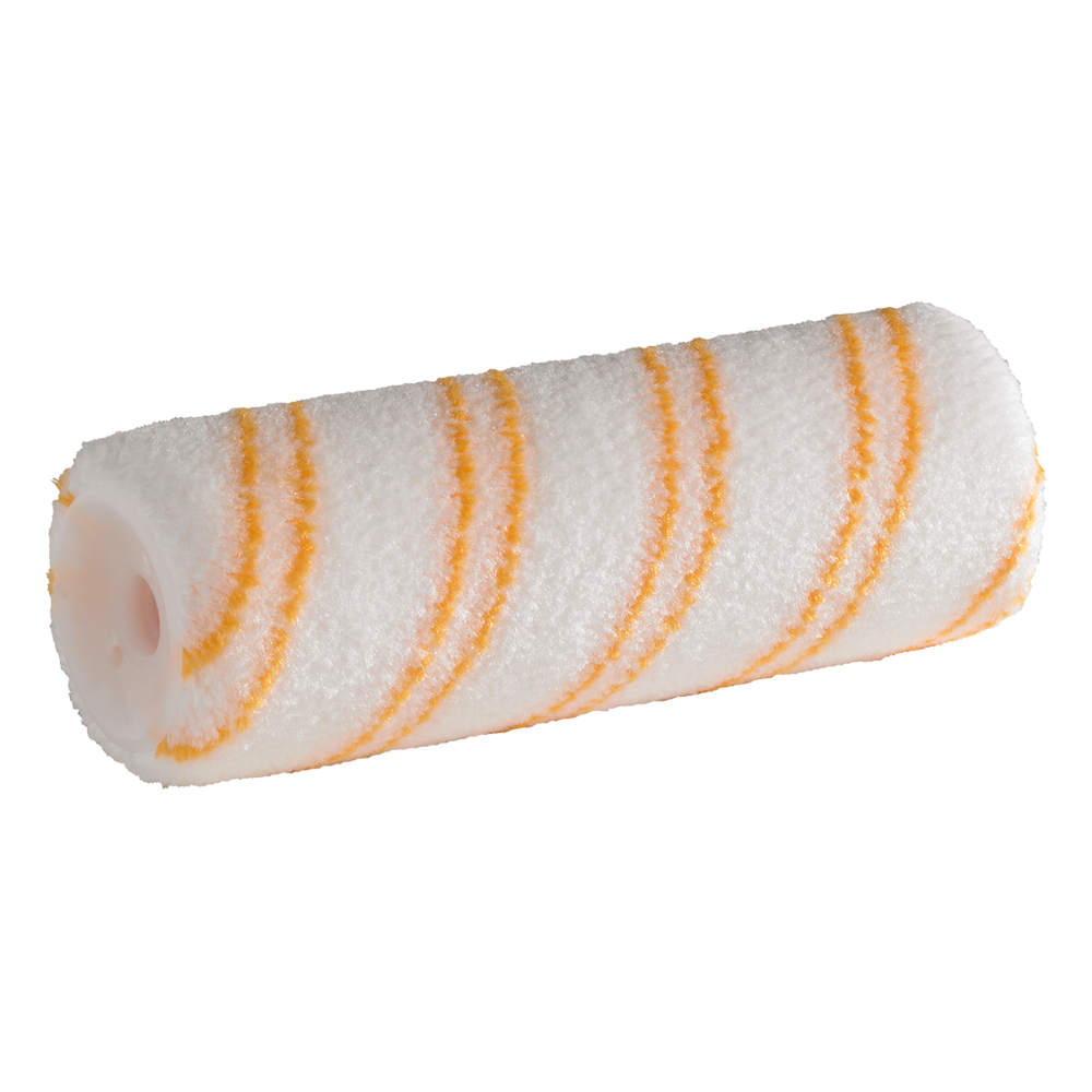 Rouleau 180 mm fibres courtes polyamide 9 mm rayé jaune. | Pour surfaces lisses et préparées, peintures phase solvant. | Sans perte de fibres garnissant. | Grain serré. | Bords retournés.
