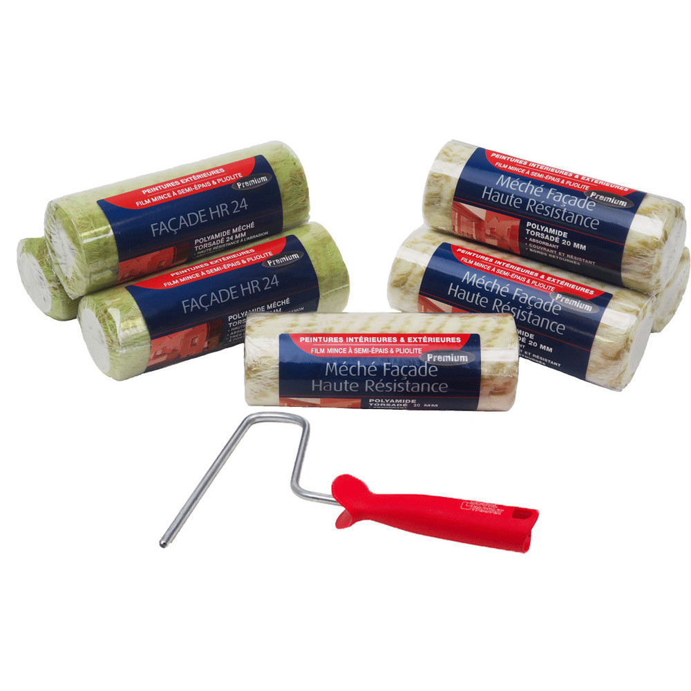 Le lot comprend 4 manchons Façade Méché Haute Résistance en polyamide méché torsadé de 20 mm, adaptés aux surfaces lisses à légèrement structurées en phase solvant, ainsi que 3 manchons Façade HR 24 en polyamide méché torsadé 24 mm à fil continu, idéaux pour l'application de peintures extérieures sur supports plus rugueux. L'ensemble est complété par 1 monture Clip permettant l'utilisation immédiate de tous les manchons du lot.