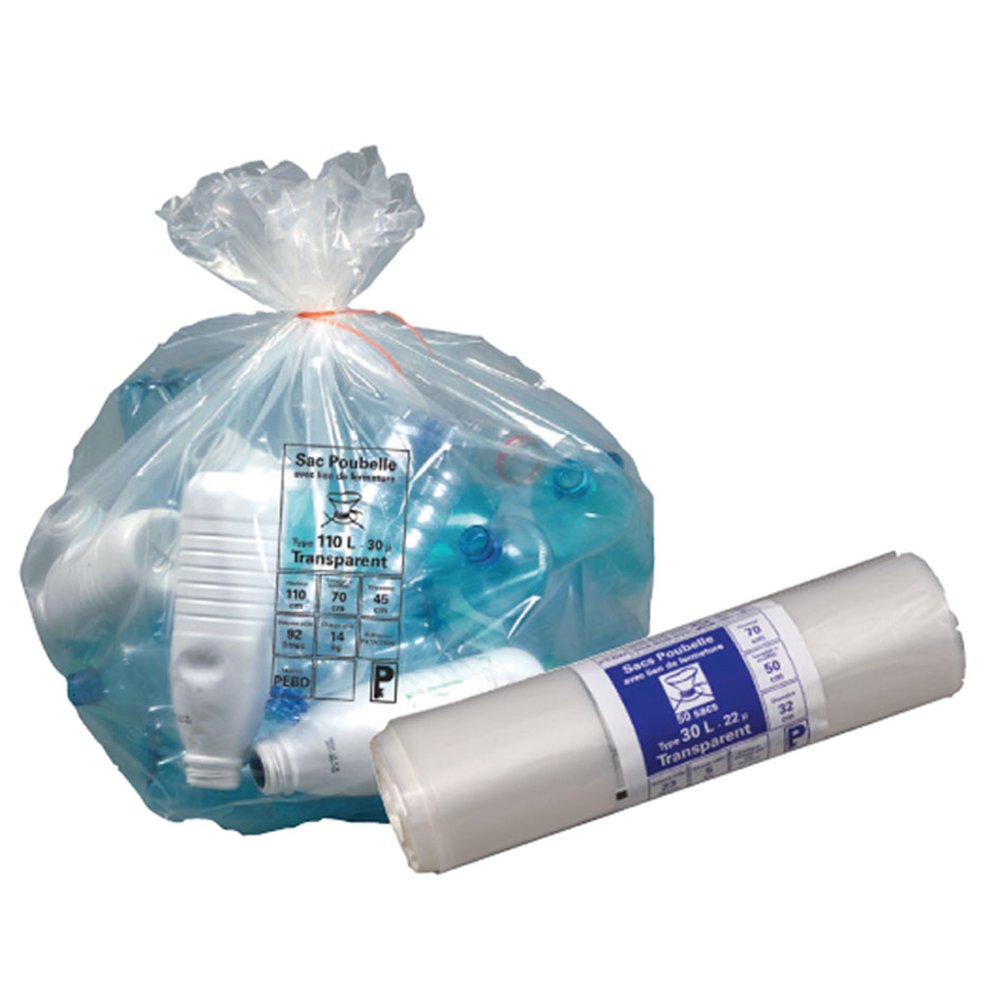 Existe en plusieurs tailles Lot de 30 sacs poubelle PUBLI EMBAL Expert avec PEBD, soudure à plat. Capacité : 50 L. Dimensions : 68x80 cm. Epaisseur : 24 microns. Coloris : transparent.