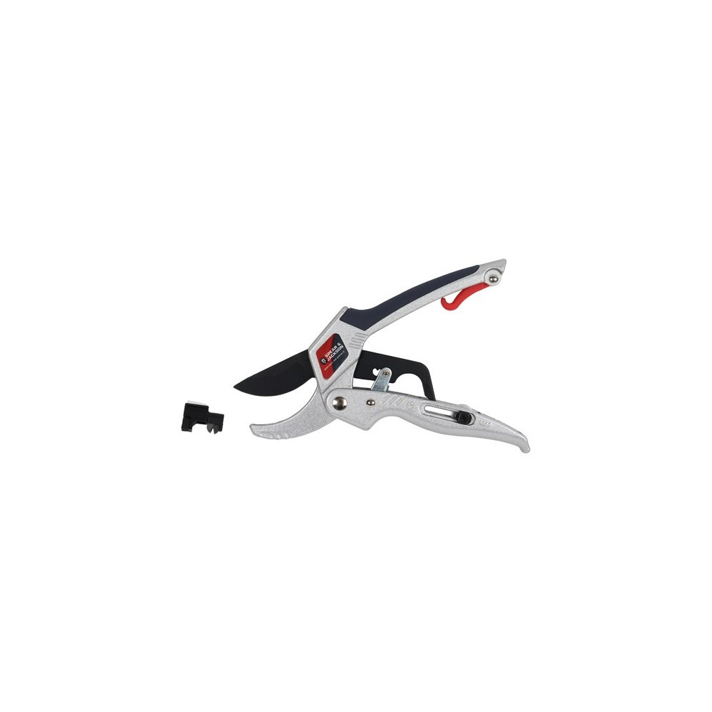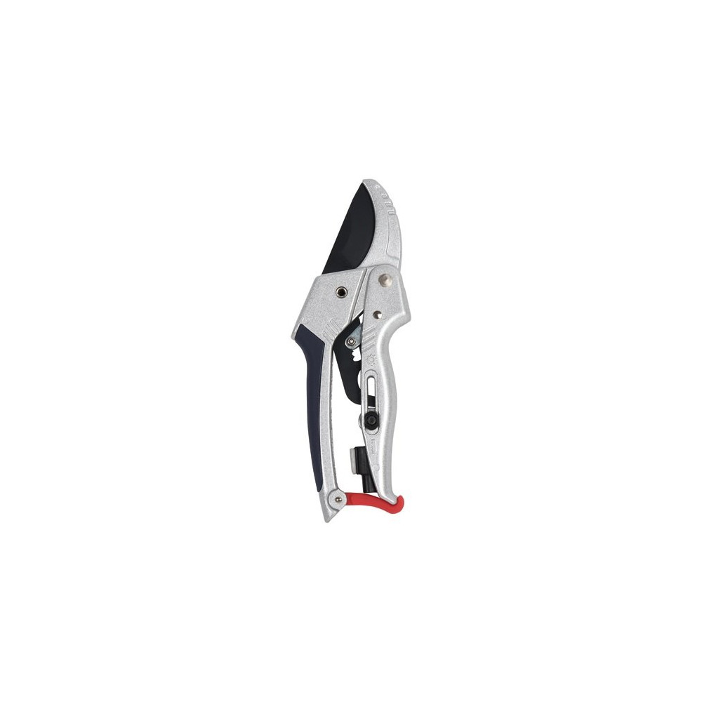 Fourni avec deux accessoires, un aiguiseur et un tampon huile. Avec lames en acier à haute teneur en carbone recouverte de téflon pour résister à la corrosion et faciliter l'entretien du sécateur.Corps robuste en aluminium et poignée avec insert antidérapant pour plus de confort. Ce sécateur peut s'utiliser avec ou sans le système de crémaillère.