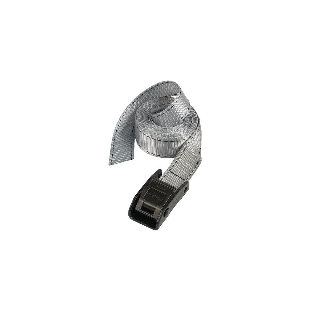 Équipée d'une boucle en zamak à dents renforcées, cette sangle développe une capacité d'arrimage de 150 kg, ce qui la positionne idéalement pour un usage bagage et transport léger à moyen. La boucle zamak garantit un serrage progressif et une tenue fiable dans la durée, sans risque de glissement. Sa largeur de 25 mm protège efficacement les surfaces fragiles en limitant les marques de pression.