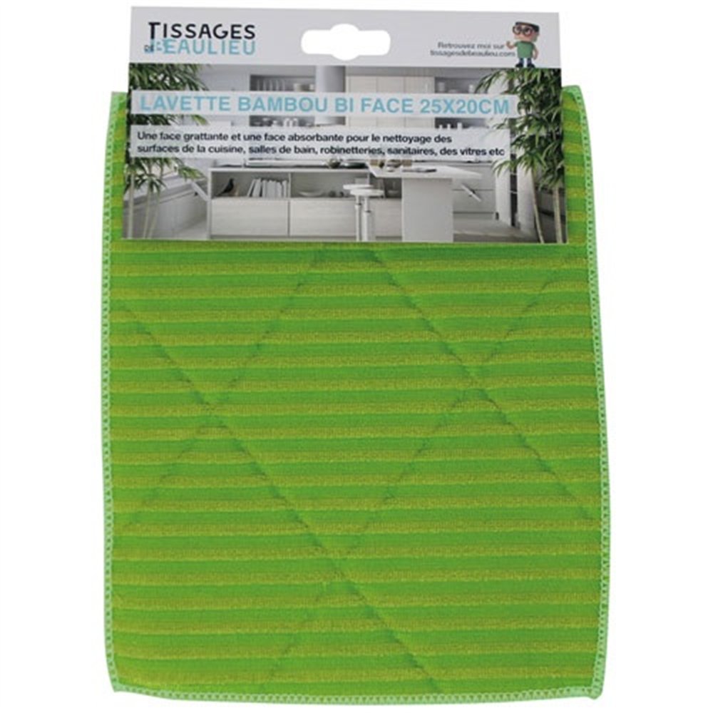 La lavette bambou bi-face TISSAGES DE BEAULIEU au format compact 25 x 20 cm est conçue pour s'attaquer efficacement à toutes les salissures du quotidien dans la cuisine, la salle de bain ou sur les sanitaires. Disponible en coloris vert, elle se repère facilement parmi vos accessoires de nettoyage.