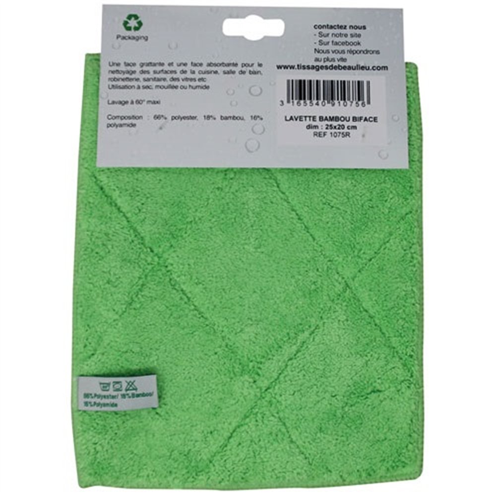 Sa composition en 66 % polyester, 18 % bambou et 16 % polyamide lui confère des propriétés remarquables. L'originalité de cette lavette réside dans sa double face fonctionnelle : une face grattante pour décoller les résidus tenaces (calcaire, graisses cuites, dépôts) et une face absorbante pour essuyer et sécher en finition sans laisser de traces.