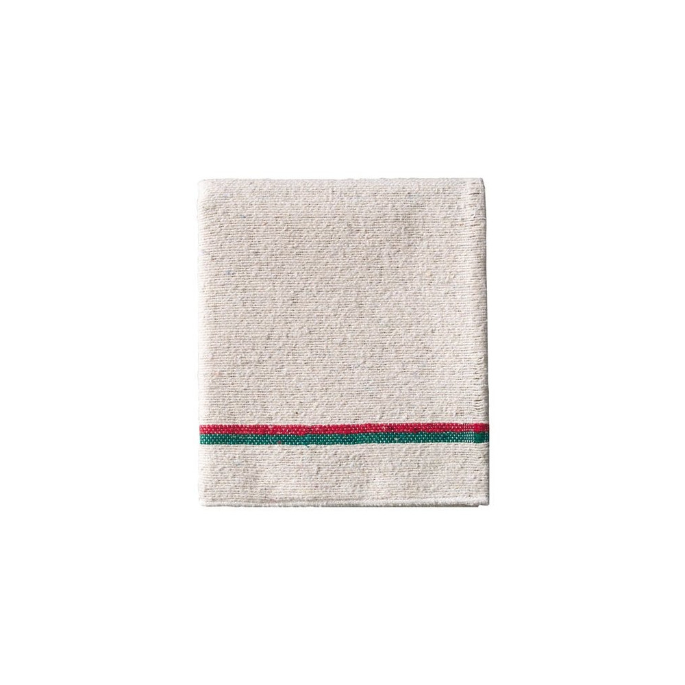 Avec pré-découpe au centre, permettant de créer 2 serpillères. Fond écru, 1 bande de couleur : 4 fils bleus + 3 fils rouges en trame de chaque côté. Ourlets piqués sur 2 côtés. Fibres diverses.