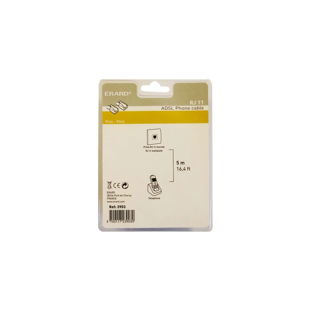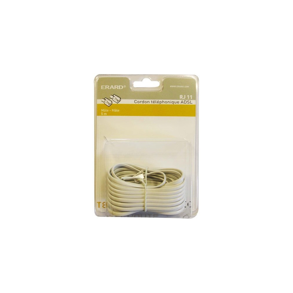 Le cordon RJ11 Erard (réf. 3903) de 5 mètres est le câble téléphonique de référence pour connecter une base téléphonique fixe à une prise murale ou à une box internet. Sobre et fonctionnel, il répond aux besoins des foyers souhaitant maintenir ou remettre en service une ligne téléphonique analogique ou numérique basse fréquence.
