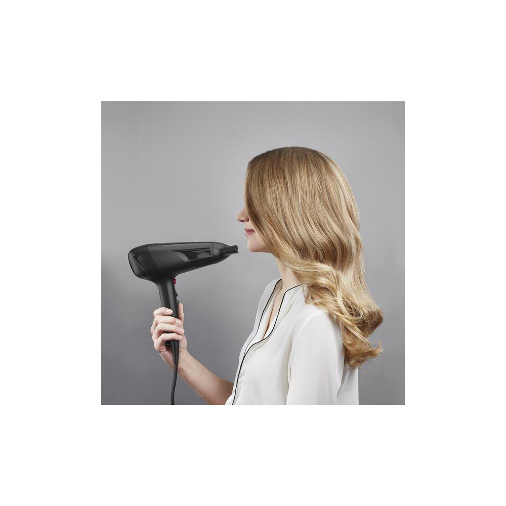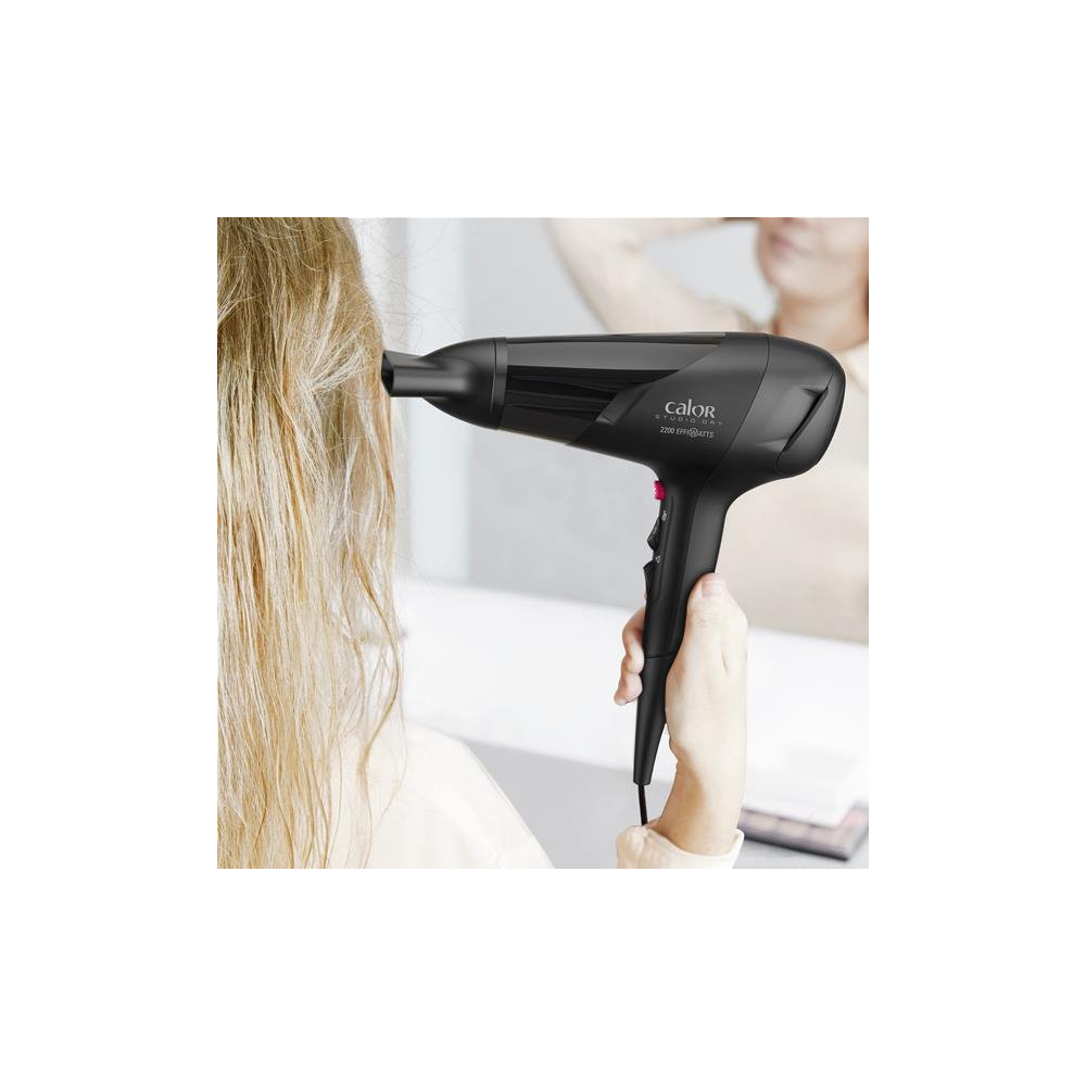 Compact, léger et redoutablement efficace, le sèche-cheveux Studio Dry CV5803C0 de CALOR disponible en coloris noir et rose est le compagnon idéal d'un séchage rapide et maîtrisé au quotidien. Sa conception soignée lui confère une excellente maniabilité, que vous soyez chez vous ou en déplacement.