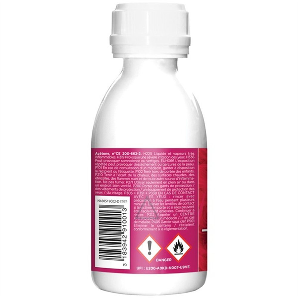 Conseil d'utilisation : utilisez l'acétone dans un espace bien ventilé, en évitant toute source de chaleur ou flamme nue — c'est un produit hautement inflammable. Portez des gants résistants aux solvants et protégez vos yeux. Tester sur une surface discrète avant utilisation sur matériaux sensibles (certains plastiques et revêtements peuvent être altérés). Conservez le flacon bien fermé à l'abri de la chaleur.