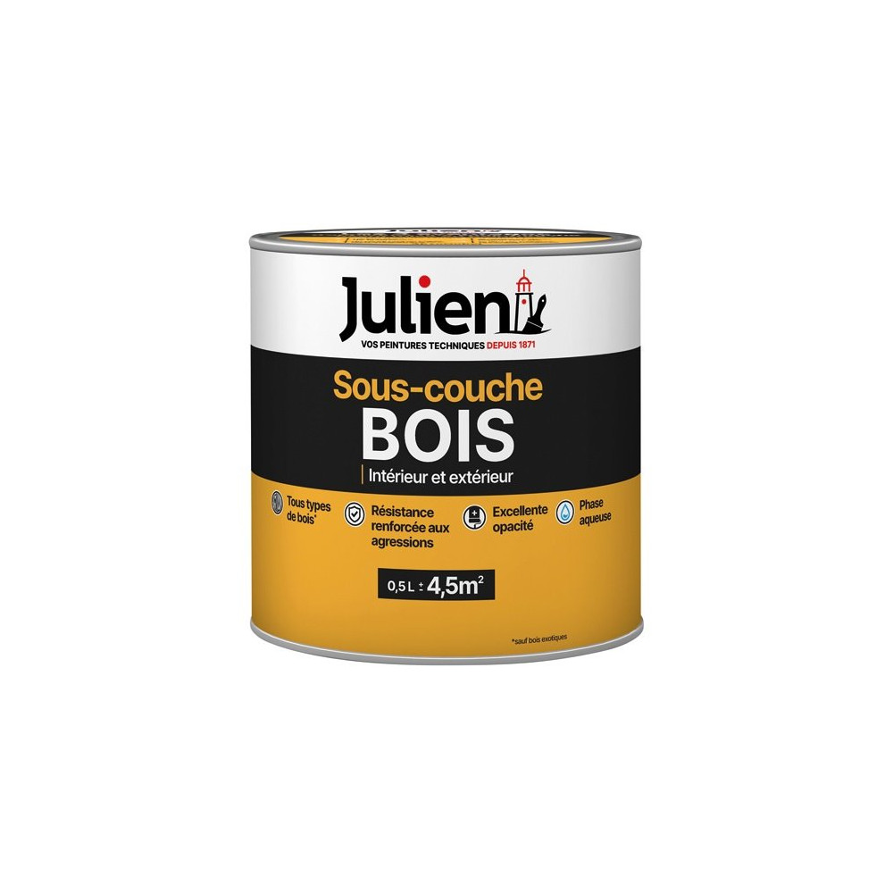 Préparer correctement un support bois avant la mise en peinture, c'est garantir la durabilité et l'adhérence du résultat final. La sous-couche bois intérieur/extérieur JULIEN en format 0,5 l est formulée en phase aqueuse pour pénétrer efficacement les fibres du bois et des boiseries, tout en offrant une protection durable contre l'humidité.