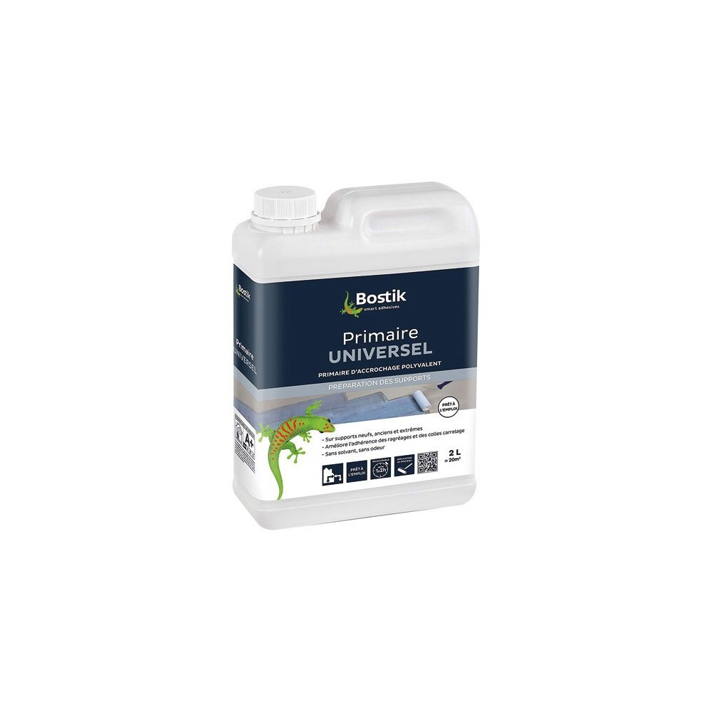 Le primaire universel de 2 L de la marque BOSTIK est spécialement conçu pour la préparation des sols et des murs. A appliquer avant la pose d'un ragréage ou d'un carrelage, il s'applique sur tous les supports, qu'ils soient neufs, anciens rigides, anciens déformables et extrêmes. Blanc à l'application, il deviendra translucide au séchage, ce qui vous permettra de savoir exactement où le primaire a été appliqué. Cela vous assure donc un gain de temps et une plus grande facilité d'application. Usa