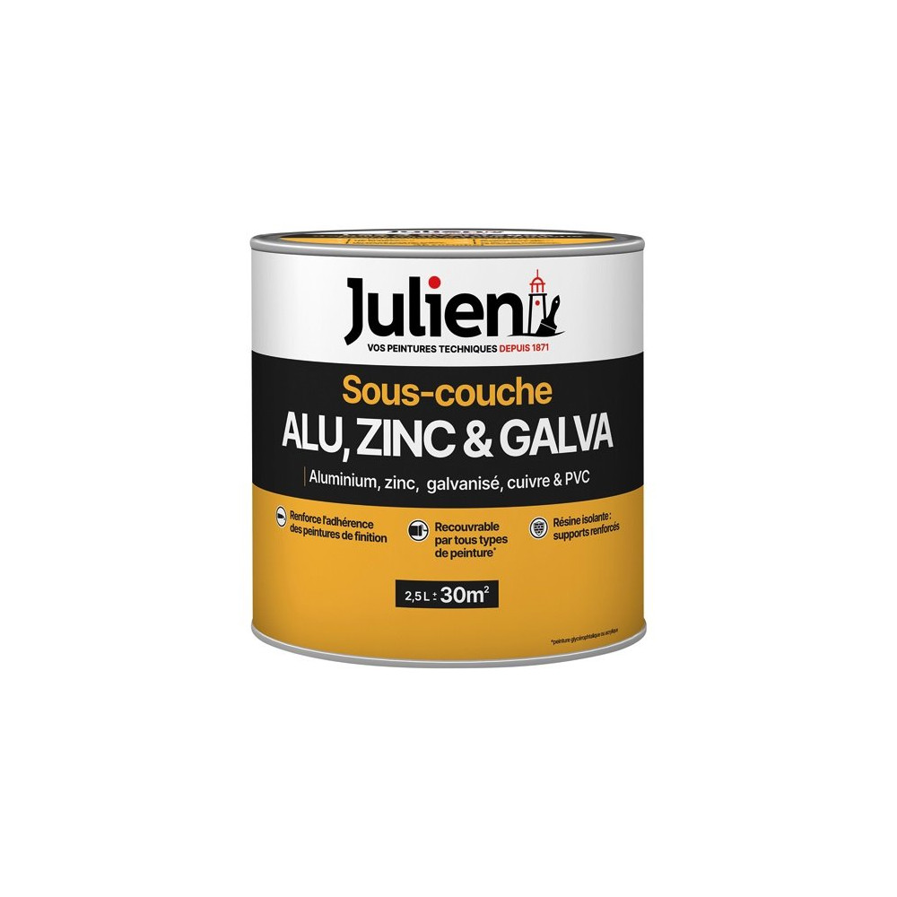 La sous-couche J1 aluminium-galva JULIEN en pot de 2,5 L est une couche primaire de préparation formulée spécifiquement pour les métaux non ferreux et les métaux légers. Elle s'adresse en priorité aux surfaces en aluminium, zinc, galvanisé oxydé ou vieilli, cuivre et inox, des matériaux réputés difficiles à peindre sans préparation adaptée. Ce conditionnement de 2,5 litres est idéal pour les travaux de moyenne à grande envergure.