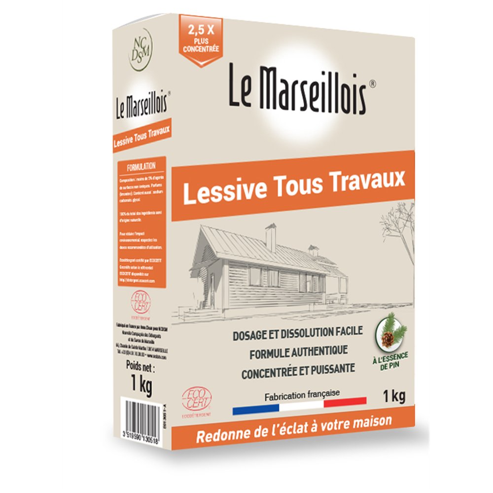 La Lessive Tous Travaux à l'Essence de Pin Le Marseillois en format 1 kg, certifiée Ecocert, est le produit nettoyant multi-usages par excellence. Formulée à base de résine de pin naturelle, elle combine une puissance nettoyante supérieure avec une approche respectueuse de l'environnement, pour s'attaquer aux salissures les plus résistantes sans compromis.