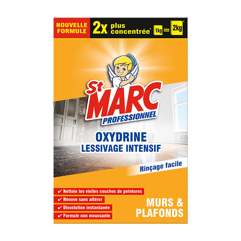 La nouvelle formule de la lessive St Marc Professionnel Oxydrine est 2x plus concentrée. | Elle est adaptée aux besoins spécifiques des professionnels du bâtiment pour le lessivage intensif et pour tous les gros travaux de la maison. | Cette lessive se dissout instantanément même dans leau froide, puis elle se rince facilement grâce à sa poudre non moussante. | Elle nettoie et décape les vieilles couches de peintures, elle rénove sans altérer les surfaces.