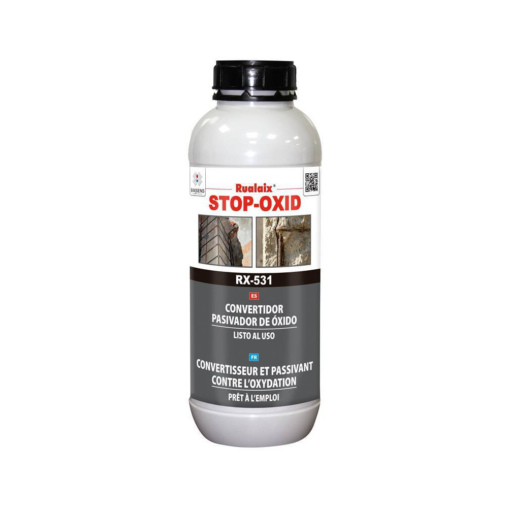 Le Stop Oxid RX-531 RUALAIX en flacon de 750 ml est un produit bi-fonctionnel à la fois passivant et convertisseur d'oxyde, spécialement conçu pour protéger les armatures métalliques et les fers des bétons armés contre la corrosion. Il s'adresse aux professionnels du BTP confrontés à des problèmes de dégradation des structures béton armé liés à l'oxydation des aciers.