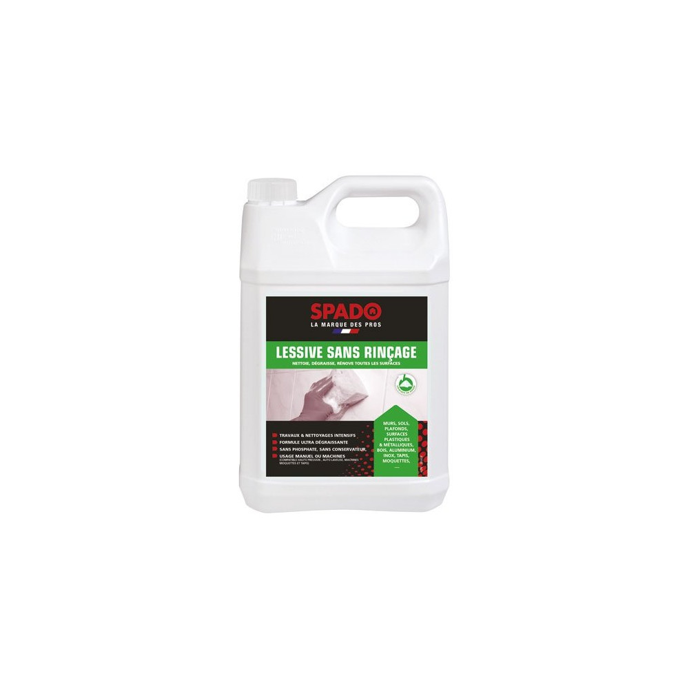 Pour les grands chantiers, les nettoyages de fond ou les utilisations professionnelles régulières, la Lessive Gros Travaux Sans Rinçage Spado Pro en bidon de 5 litres est le format économique et pratique de référence. Elle nettoie, décape et dégraisse en une seule application sans altérer les surfaces, sur une gamme extraordinairement large de matériaux, le tout sans rinçage obligatoire.