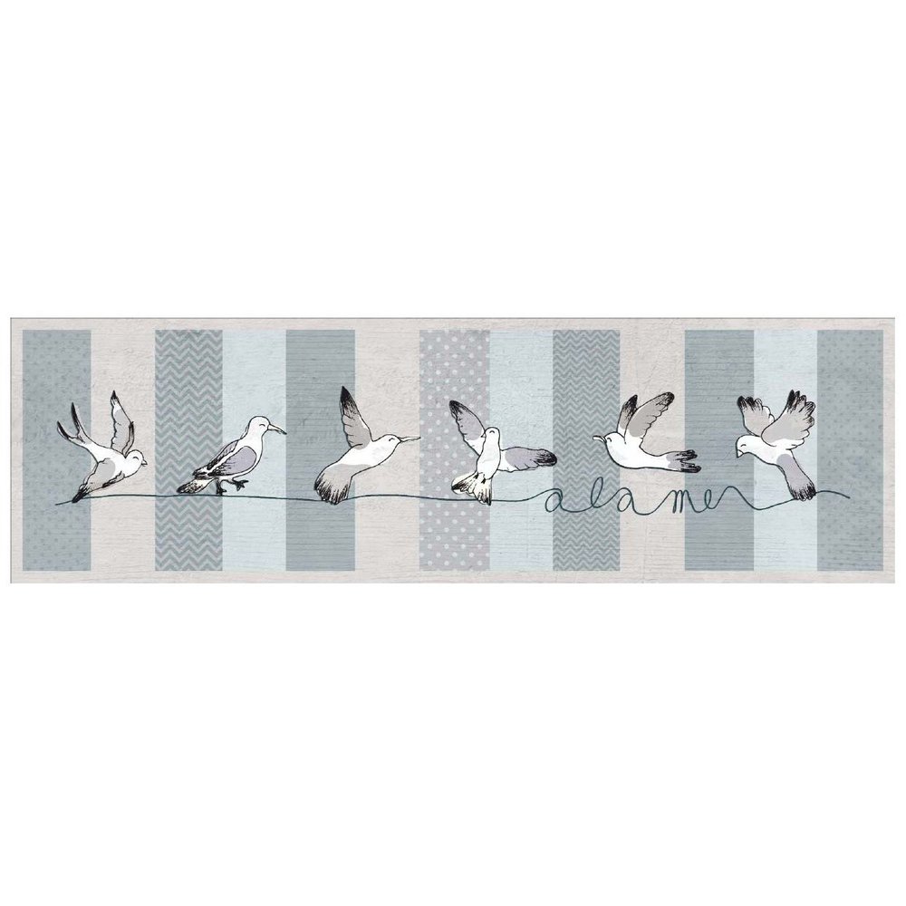 Transportez votre intérieur au bord de l'océan avec le tapis Velvet Ocean de Mercury en 45 x 150 cm. Son motif poétique d'oiseaux en vol sur fond rayé bleu-gris, rehaussé de l'inscription « à la mer » en filigrane, insuffle une atmosphère marine douce et apaisante, idéale pour une entrée, un couloir ou une chambre.