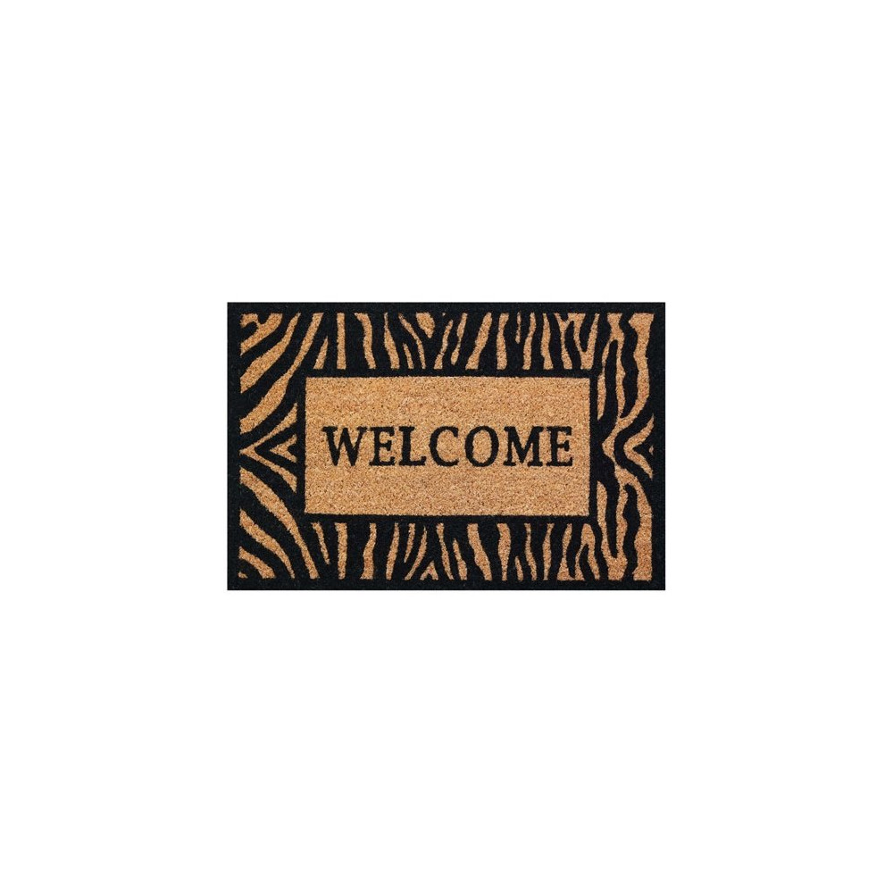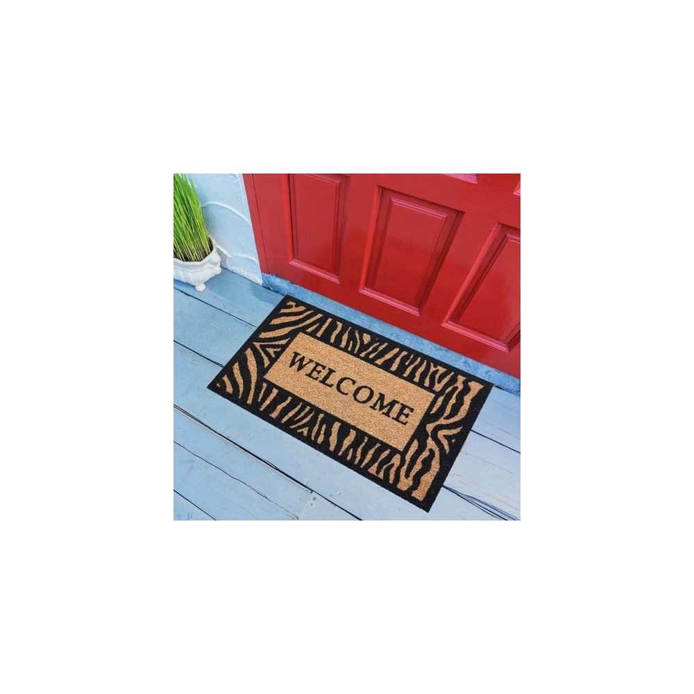 Le tapis d'entrée IDMAT Welcome Zèbre en fibre de coco naturelle conjugue efficacité grattante et style graphique. Au format 40 x 60 cm et avec ses 15 mm d'épaisseur généreux, il accroche instantanément les salissures des semelles pour garder votre intérieur propre, tout en affichant un motif zèbre tendance qui personnalise votre seuil de porte.