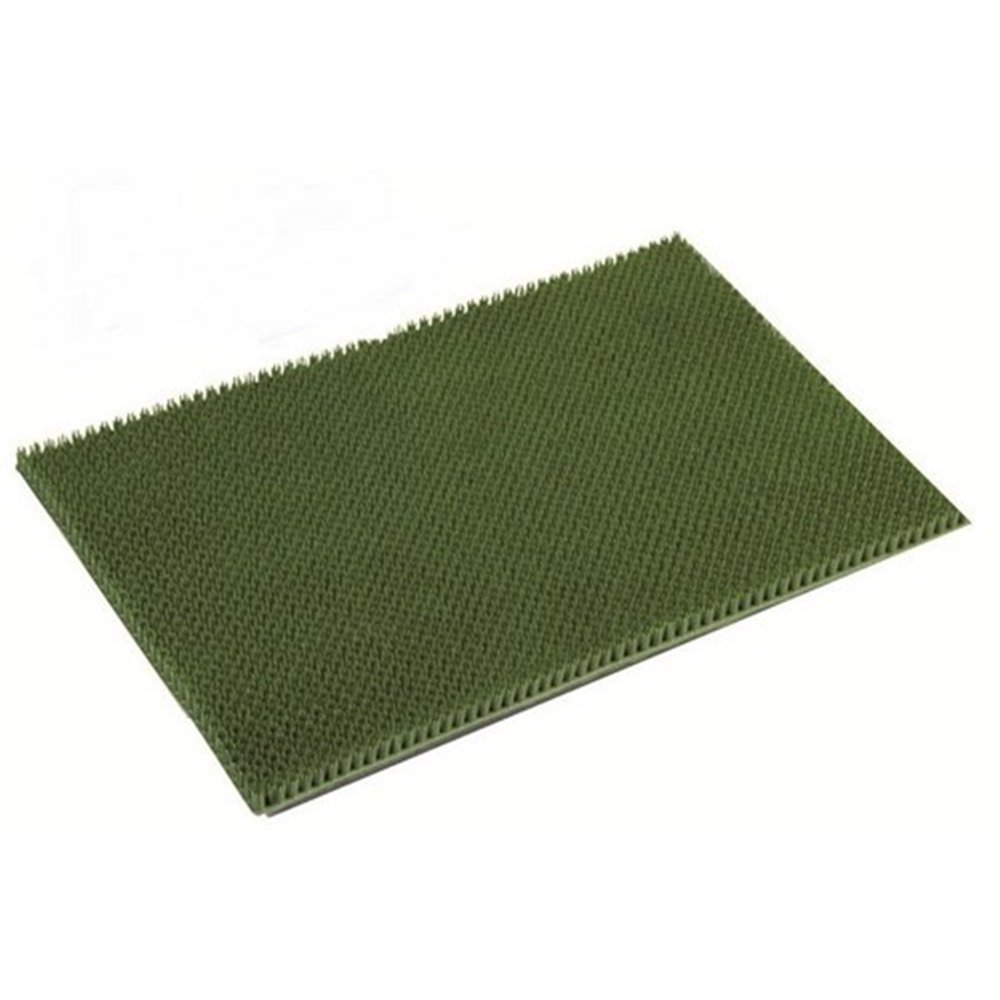 Fabriqué en 100 % polyéthylène, ce tapis est particulièrement adapté aux conditions extérieures difficiles. Il résiste aux intempéries — pluie, humidité, UV — sans se déformer ni perdre sa couleur dans le temps. Sa structure en relief, qui rappelle les brins d'herbe, retient efficacement la boue, la poussière et les débris de semelles avant qu'ils n'atteignent l'intérieur.