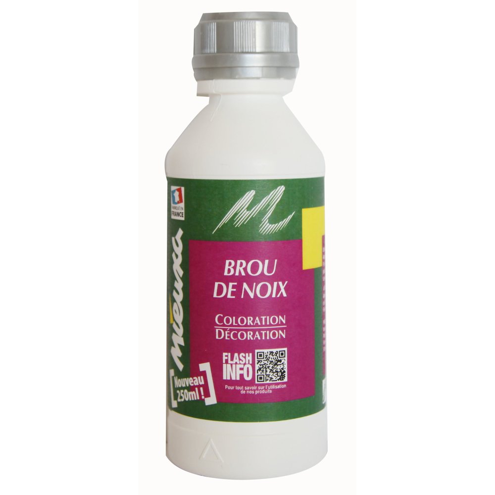 Le Brou de Noix Mieuxa en flacon de 250 ml est une teinture naturelle d'origine végétale, appréciée depuis longtemps pour sa capacité à apporter aux bois une teinte chaude et authentique. Issu de la noix, il pénètre en profondeur dans les fibres du bois pour lui conférer une belle couleur brune aux nuances naturelles et vivantes.