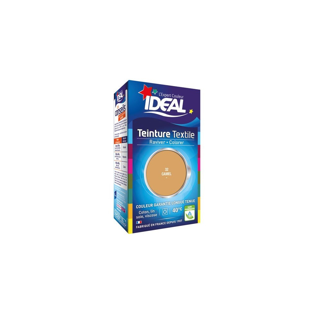 Existe en plusieurs coloris Teinture IDEAL coton, soie, viscose, pour teindre jusqu'à 200 g de textile et jusqu'à 1 Kg pour une nuance claire. Simple et efficace. L'étui contient : 1 barquette de teinture de 40 mL et 1 barquette de fixateur (50 g).. Coloris : capuccino 32. Utilisation en lave-linge : Découpez l'angle de chacune des barquettes à l'aide ciseaux. Placez 2 barquettes, sans les vider, dans le tambour. Recouvrez les barquettes avec 500 g de sel, quel que soit le nombre d'étuis utilisé
