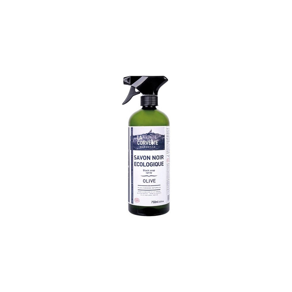 Sa teinte noire caractéristique témoigne de la richesse en huile d'olive de sa formulation, sans colorant artificiel. Le flacon spray de 750 ml est ergonomique et pratique : il permet une application directe et dosée sur les surfaces à traiter, sans dilution préalable, ce qui en fait un outil de nettoyage instantané aussi bien pour la maison que pour le jardin.
