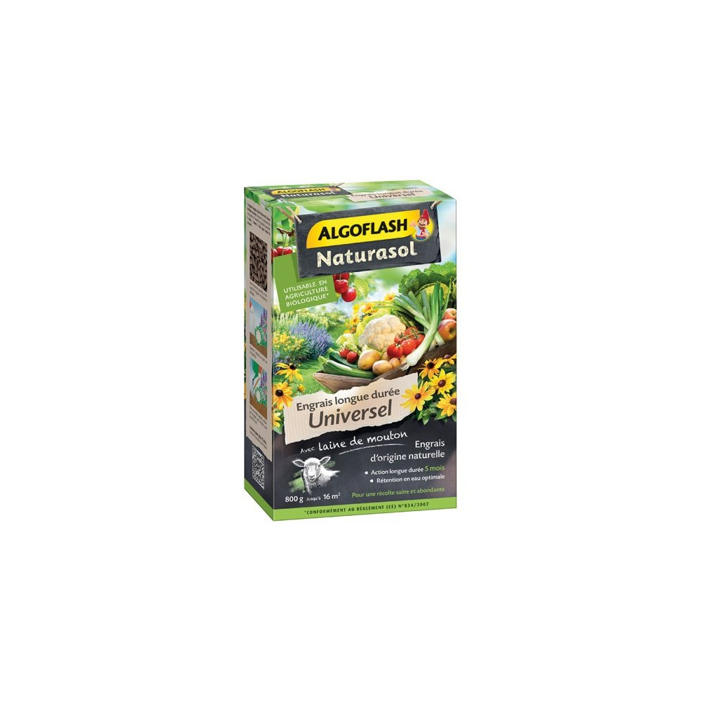 Issu d'une démarche éco-responsable, l'engrais universel longue durée Algoflash Naturasol en format 800 g est composé à 50 % de laine de mouton, une matière première naturelle aux propriétés nutritives et hydriques exceptionnelles. Utilisable en agriculture biologique, il répond aux attentes des jardiniers soucieux de prendre soin de leurs cultures tout en respectant l'environnement.
